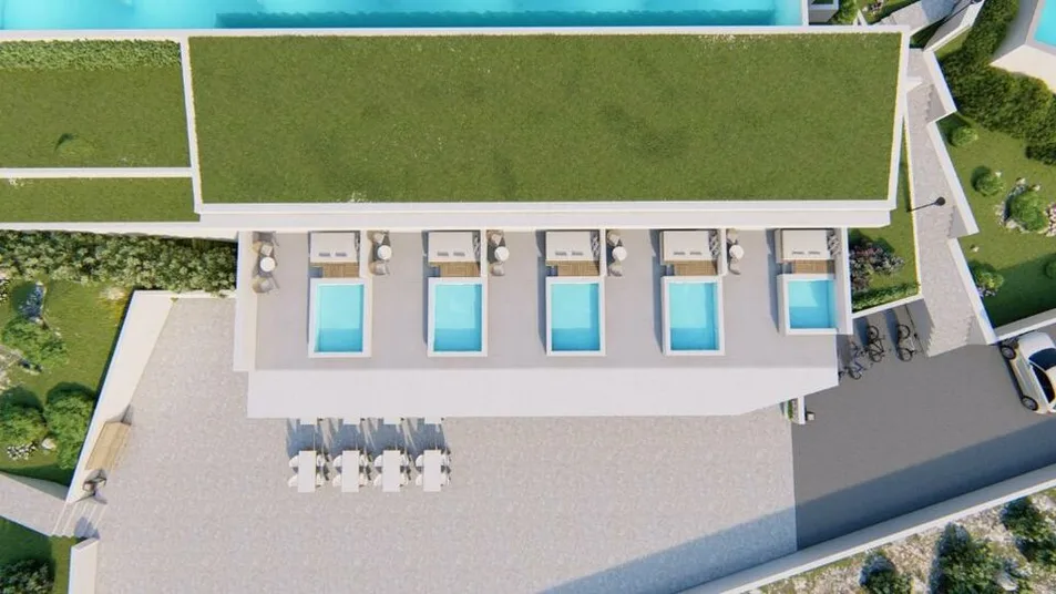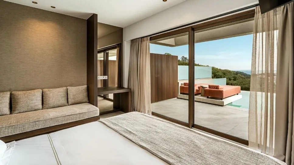 Smeštaj je osmišljen za udoban boravak uz naglasak na pogled i komfor, uz uslugu na nivou 4 zvezdice. Hotel nudi moderno uređene dvokrevetne sobe i prostranije opcije: Superior Double (oko 25 m², za 2 osobe), Premium Double (oko 28 m², do 3 osobe), Executive Double (oko 30 m², do 3 osobe) i elegantne apartmane Junior (do oko 35–38 m², do 4 osobe). Većina jedinica ima balkon ili terasu, a pojedine sobe nude privatni ili zajednički bazen ili manji bazen za osveženje.