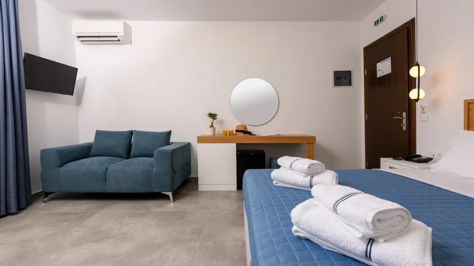 Smeštaj čine udobne, savremeno uređene sobe sa balkonom i pogledom na bazen, vrt ili okruženje. U ponudi su dvokrevetne sobe (bračni ili odvojeni ležajevi), trokrevetne, kao i dvokrevetne sa pomoćnim ležajem, dok su za porodice dostupne prostranije opcije poput porodičnih soba i apartmana. Većina jedinica je klimatizovana i opremljena frižiderom, fenom i televizorom ravnog ekrana, što boravak čini praktičnim i komfornim.