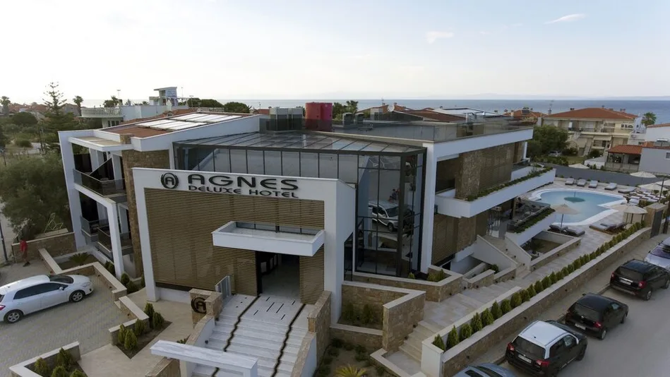 Hotel Agnes Deluxe se nalazi u Pefkohoriju, na Kasandri, na Halkidikiju, u atraktivnom primorskom okruženju gde su šetalište, kafići i prodavnice lako dostupni peške. Prema dostupnim podacima, objekat je smešten na samoj obali i nalazi se na oko 1 minut hoda od plaže Pefkohori, što ga čini odličnim izborom za goste koji žele more „na dohvat ruke“. Do aerodroma u Solunu putuje se približno 94 km, pa je dolazak jednostavan i za individualne goste i za organizovane transfere.