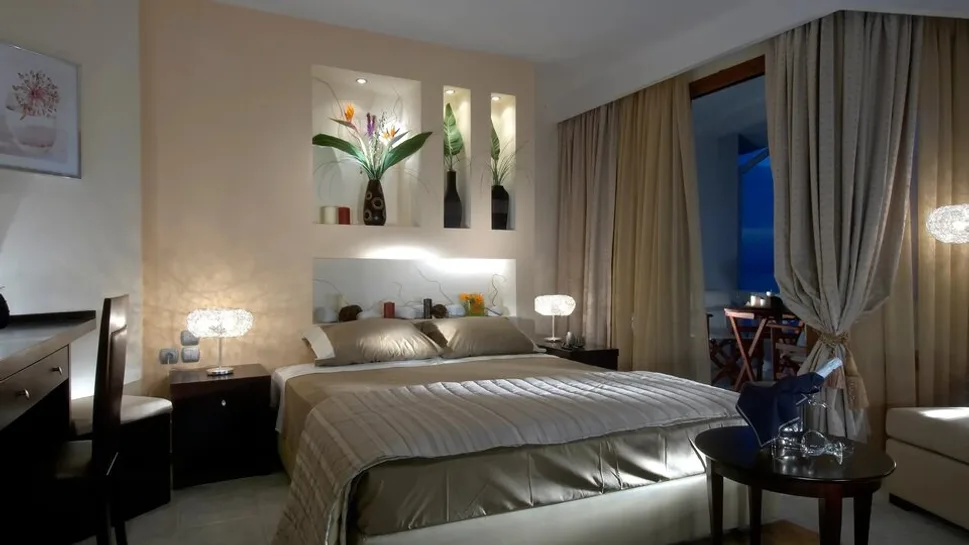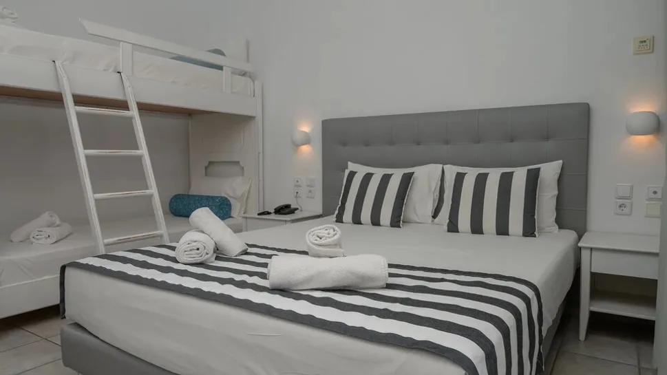 Smeštaj je organizovan u komfornim sobama i apartmanima, uz izbor pogleda na more, bazen ili vrt. Hotel raspolaže sa približno 80 smeštajnih jedinica, a u ponudi su dvokrevetne sobe (mogu da prime do tri osobe), superior sobe, kao i porodične sobe pogodne za boravak do četiri gosta. Većina jedinica ima balkon ili terasu, uz standarde koji uključuju klimatizaciju, televizor sa satelitskim programima, mali frižider i bežični internet.