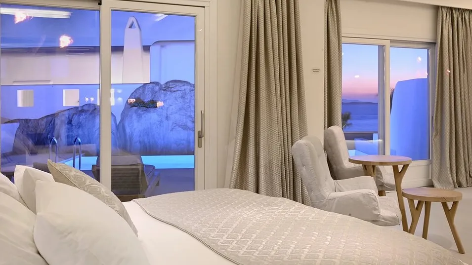 Smeštajne jedinice su osmišljene u modernom kikladskom stilu, sa naglaskom na svetle tonove, eleganciju i privatnost. U ponudi su deluxe sobe i različiti tipovi apartmana, uključujući i apartmane sa privatnim bazenom, kao i prostrane varijante sa dve spavaće sobe, pogodne za porodice ili društvo. Površine se kreću od oko 30 m², dok najkomforniji apartmani dostižu i oko 75 m², uz terase i pogled na more.