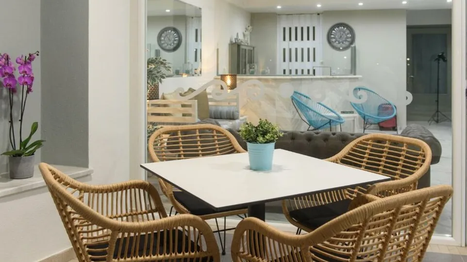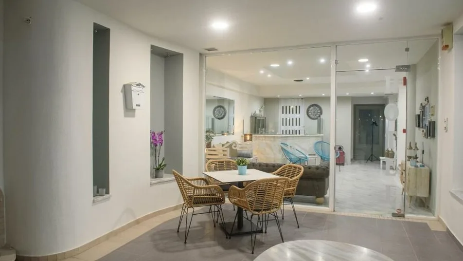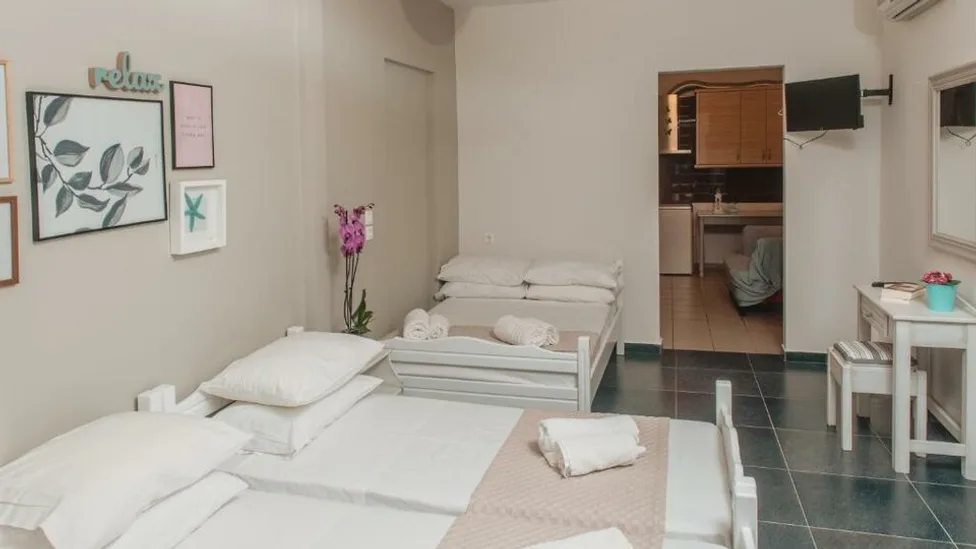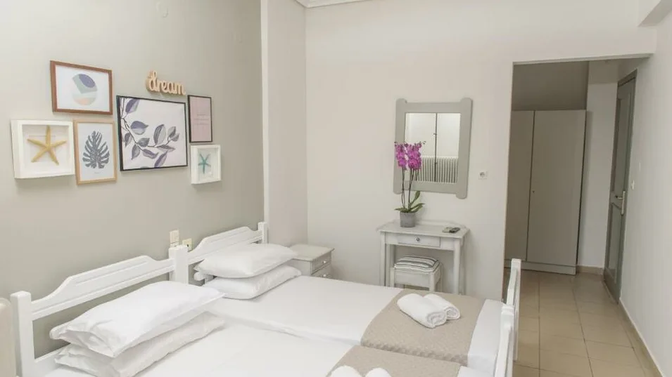 Kao hotel sa 3 zvezdice, Aqua Beachfront nudi praktičan i komforan smeštaj za parove i porodice. U ponudi su standardne sobe, kao i prostraniji porodični apartmani sa dve spavaće sobe, pogodni za smeštaj višečlanih porodica ili prijatelja koji žele više privatnosti. Sobe su opremljene sopstvenim kupatilom, televizorom, frižiderom, klima-uređajem, kao i bežičnim internetom, a pojedine jedinice imaju i balkon. ([aquahotel.gr](https://aquahotel.gr/?utm_source=openai))