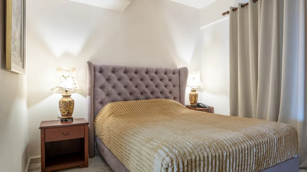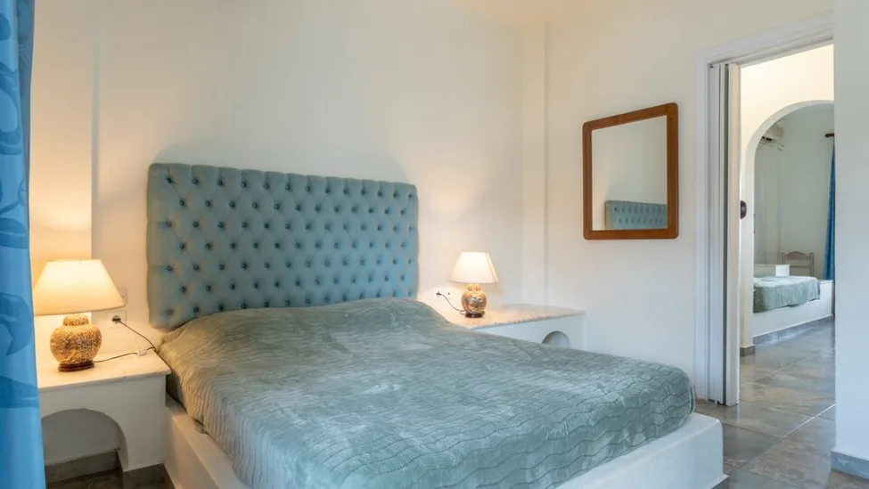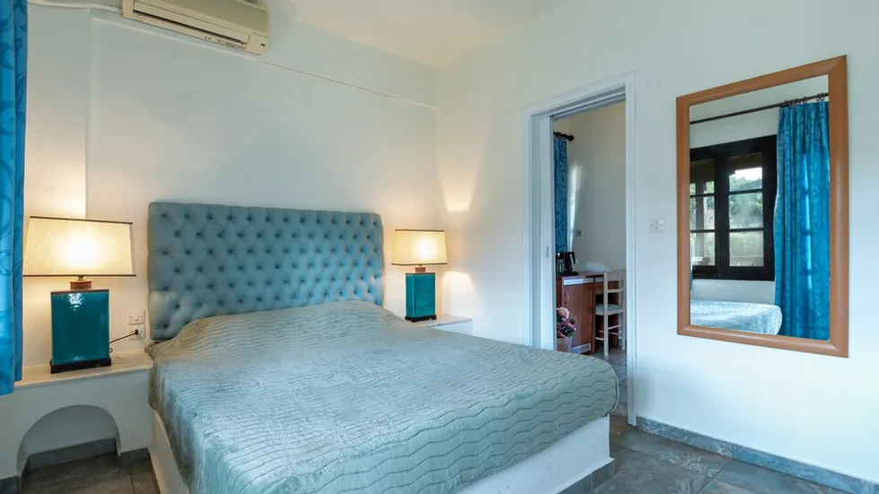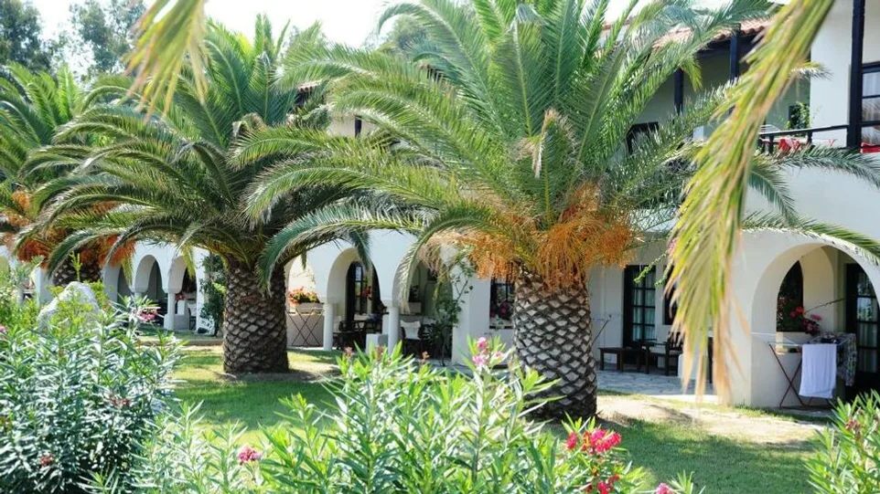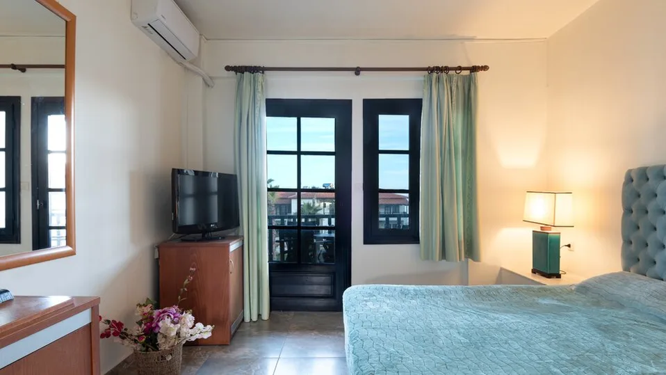 Smeštaj je organizovan u resort stilu, uz prijatan raspored objekata i staza, pa hotel ostavlja utisak malog mediteranskog naselja. Ukupno raspolaže sa 66 soba, među kojima su dvokrevetne sobe (sa pogledom na vrt ili more), kao i prostranije porodične varijante. Standardne sobe su oko 25 m², dok su porodične sobe i apartmani približno 35 m², pogodni za smeštaj porodica i gostiju kojima je važniji komfor. Sobe su opremljene klima-uređajem, televizorom, frižiderom, sefom, fenom i balkonom ili terasom.