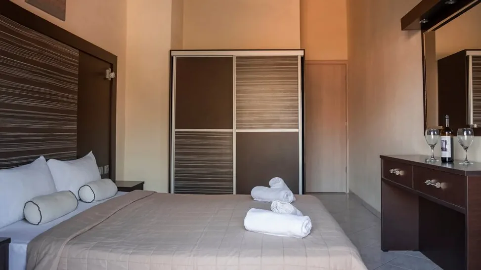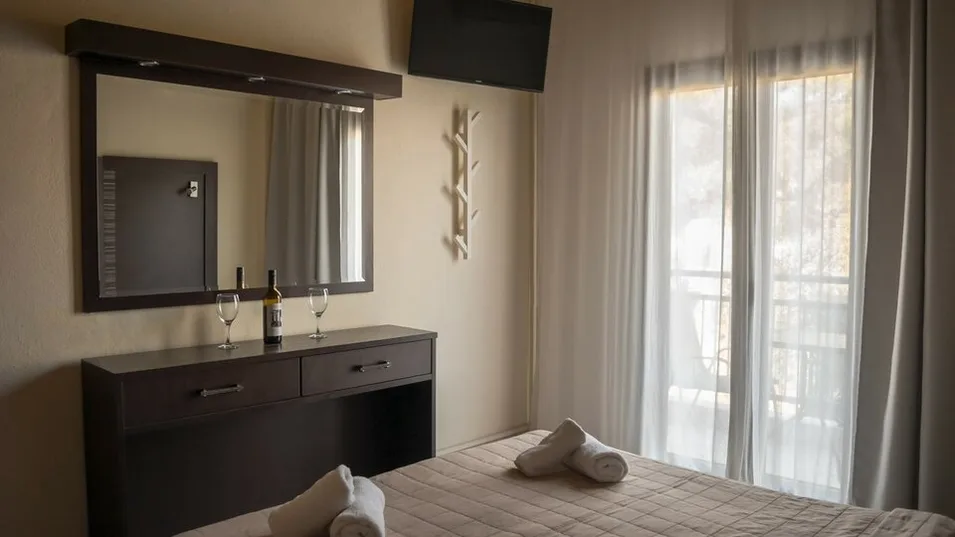 Smeštaj čine klasične hotelske sobe i apartmanske jedinice, ukupno oko 25 smeštajnih jedinica, uz modernije, novije uređene varijante. Posebno se izdvajaju kabana apartmani sa mermernim podovima, koji mogu imati pogled na more ili se nalaze u renoviranom dvorišnom delu, blizu bazena. Za goste koji vole praktičnost, dostupni su i studiji u dvorištu, a pojedine jedinice imaju čajnu kuhinju. Postoje i veći apartmani pogodni za porodice, sa kapacitetom do četiri osobe, uz bračni krevet i pomoćni ležaj.