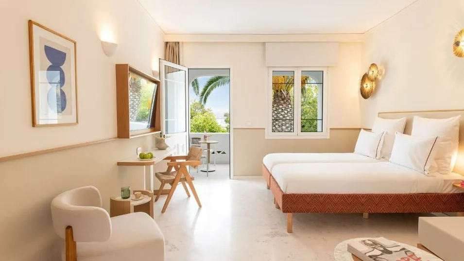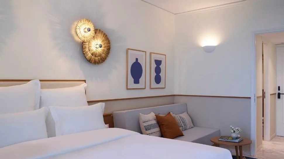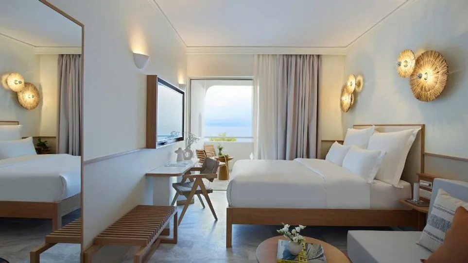 Hotel kategorije 4 zvezdice raspolaže sa 119 soba i apartmana, osmišljenih u savremenom stilu uz diskretne kikladske detalje i svetle tonove. U ponudi su sobe sa pogledom na vrt ili bazen, kao i bungalovi, a pojedine smeštajne jedinice mogu da prime do četiri osobe, što je praktično za porodice ili manje društvo. Standard udobnosti upotpunjuju balkon ili terasa, kao i sadržaji poput bežičnog interneta, mini-bara i sefova.
