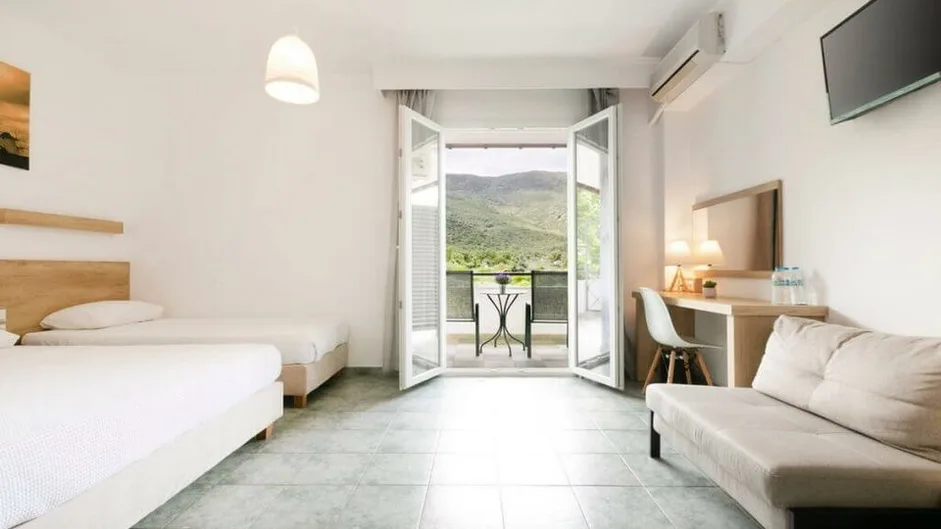 Smeštaj čini 22 sobe, pažljivo uređene u toplim tonovima, sa detaljima koji spajaju tradicionalnu i modernu estetiku. U ponudi su ekonomične i standardne sobe sa pogledom na more, zatim komforne sobe (sa pogledom na more ili planinu), kao i porodične sobe sa pogledom na planinu, pogodne za boravak do četiri osobe. Sve jedinice su zamišljene kao udoban kutak za odmor nakon dana na plaži, uz prijatnu atmosferu i funkcionalan raspored.