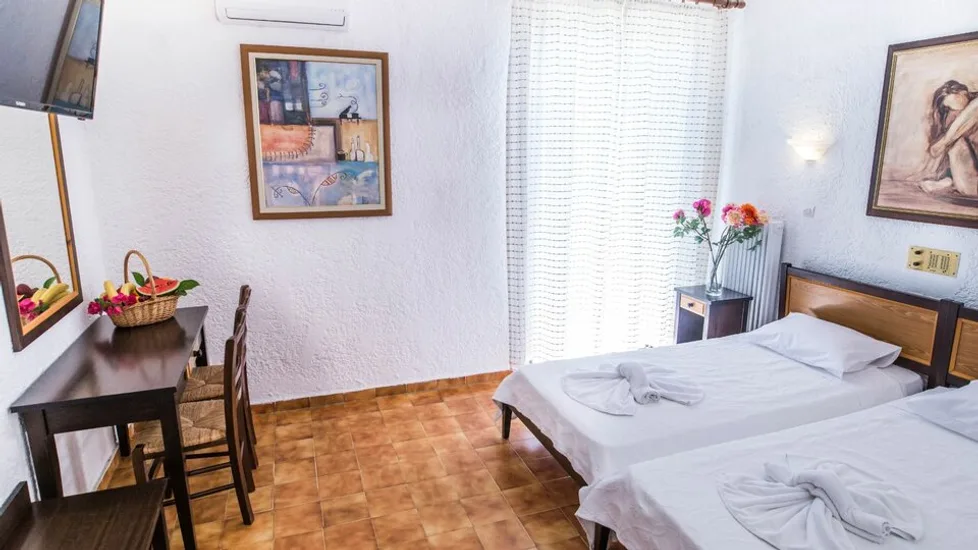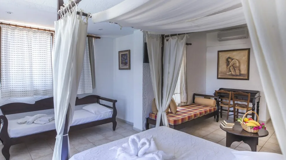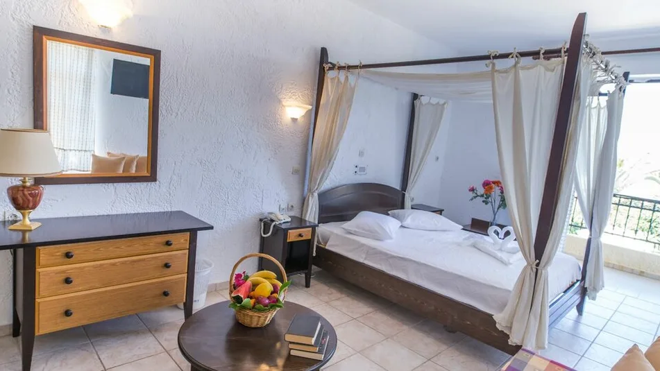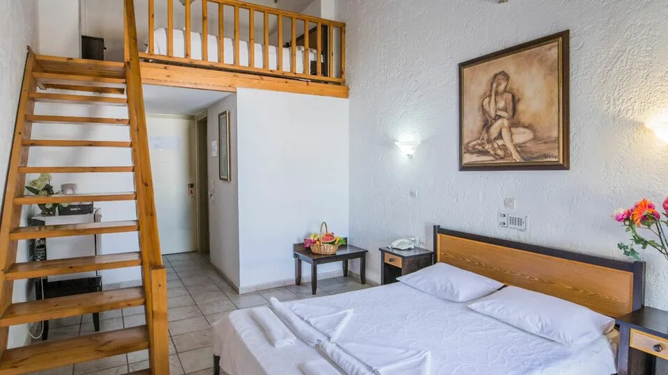 Smeštaj je organizovan u komfornim sobama i porodičnim jedinicama, ukupno 51 soba, koje su osmišljene za parove i porodice. U ponudi su dvokrevetne sobe sa pogledom na vrt ili more, kao i prostranije porodične opcije, uključujući loft i superior porodične sobe. Većina jedinica ima balkon ili terasu, a enterijer je svetao i funkcionalan, idealan za odmor nakon dana na plaži ili izleta po ostrvu.