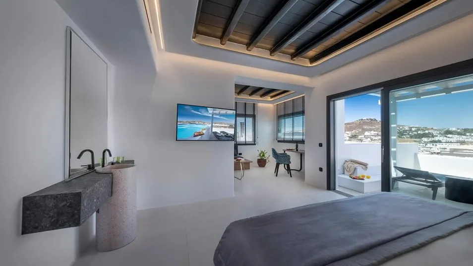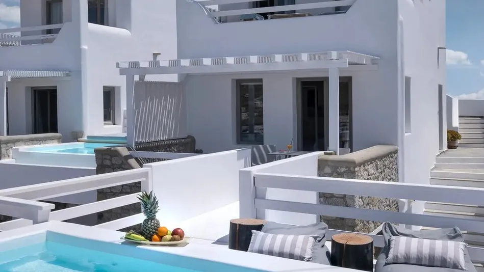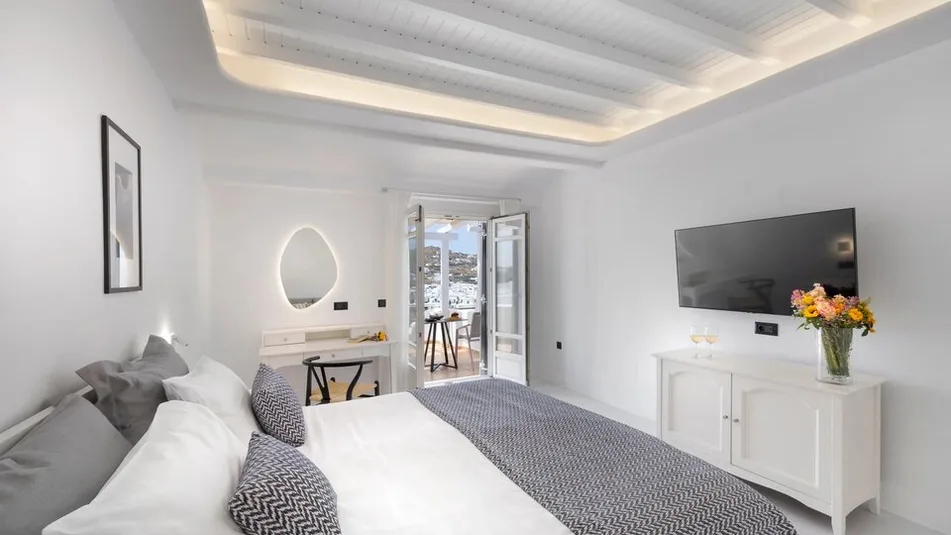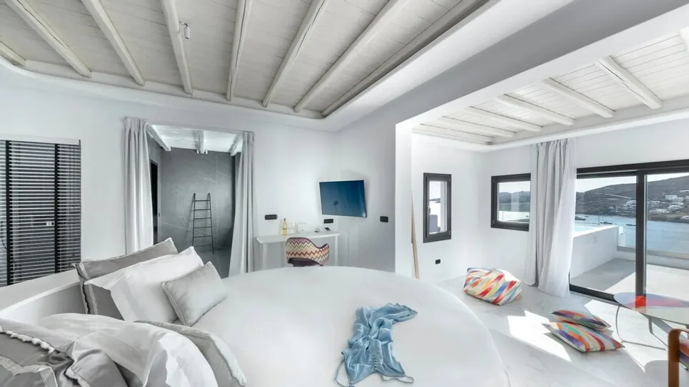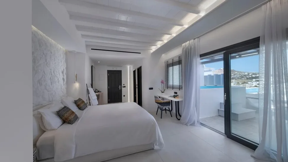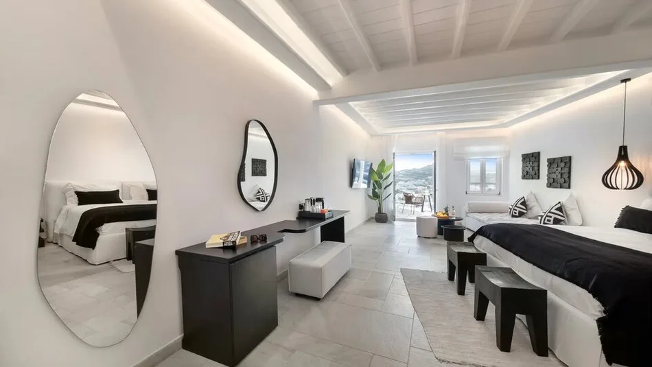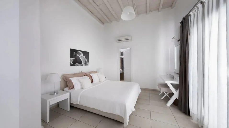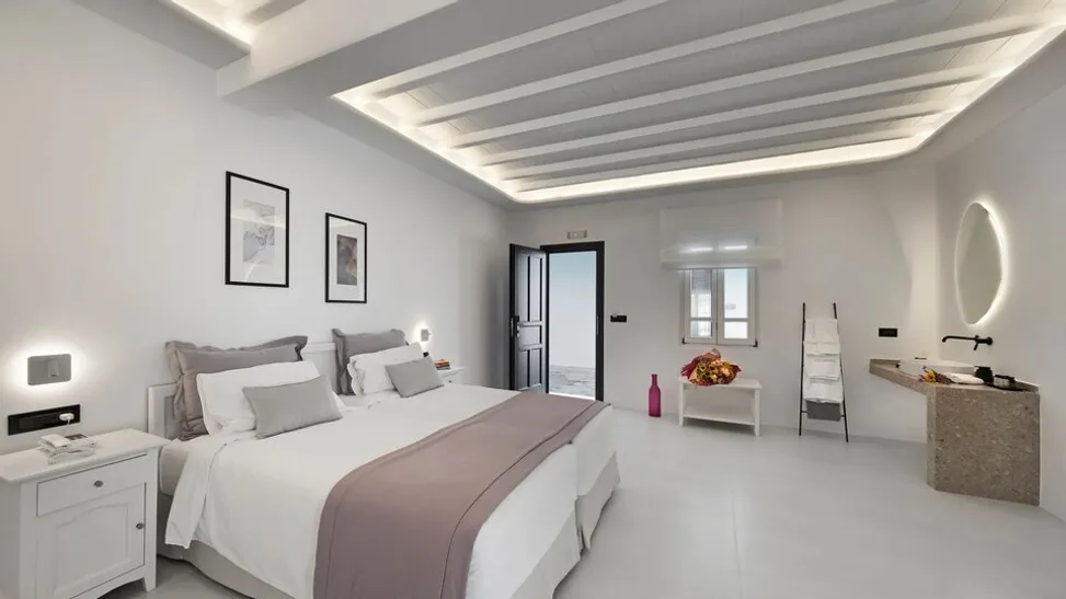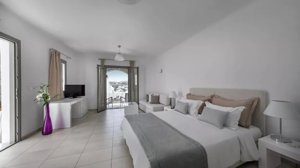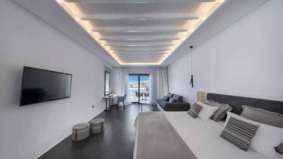 Smeštaj je osmišljen u svetlom, kikladskom stilu, sa akcentom na prostranost i udobnost. Gostima su na raspolaganju različite kategorije soba i apartmana, uključujući komforne dvokrevetne sobe, sobe sa delimičnim ili direktnim pogledom na more, kao i veće smeštajne jedinice za više osoba. Hotel raspolaže sa ukupno 34 sobe, a većina nudi prijatan pogled ka zalivu Ornos i idealna je za opuštanje nakon dana na plaži.