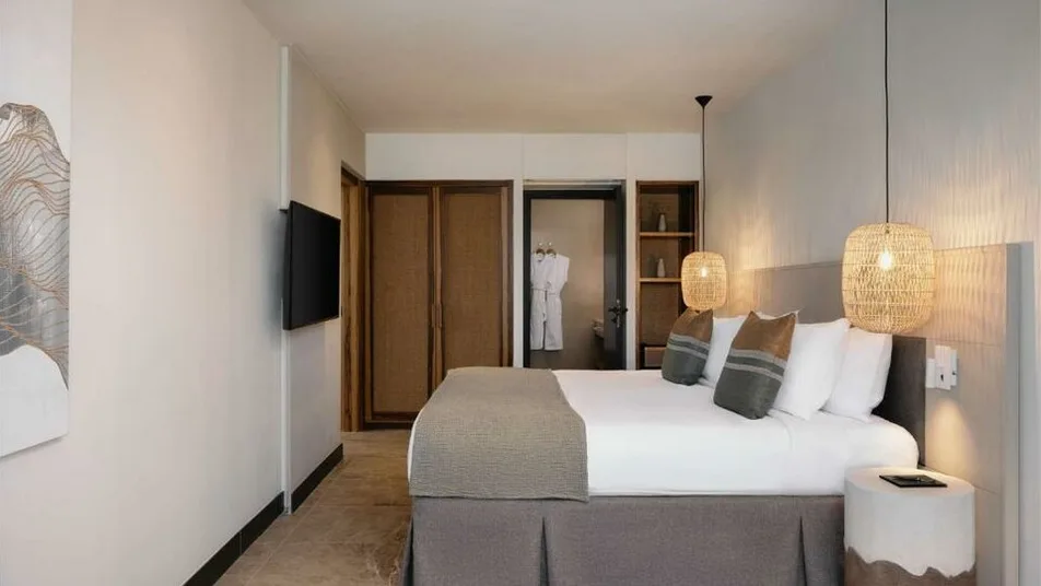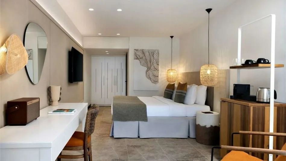 Smeštaj je osmišljen kao elegantno utočište za odmor u paru, sa sobama i apartmanima koji imaju balkon ili terasu i pogled na zaliv. Hotel raspolaže sa 201 sobom i apartmanom, uključujući komforne sobe za dvoje i prostranije varijante za goste koji žele više prostora, kao i premium apartmane u okviru posebne selekcije sa dodatnim pogodnostima. Enterijeri su savremeni, udobni i prilagođeni opuštanju posle dana na plaži ili pored bazena.