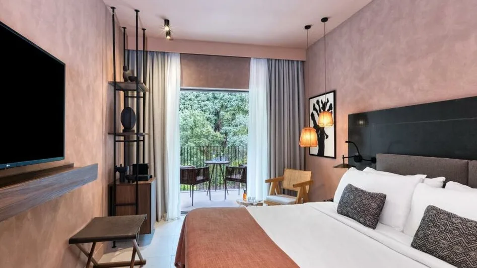 U ponudi su moderno uređene smeštajne jedinice, ukupno 236 soba i apartmana, sa pogledom na vrt, planine ili Jonsko more. Gostima su dostupne klasične dvokrevetne sobe, porodične opcije, kao i prostraniji apartmani za komforniji boravak, posebno pogodni za porodice sa decom. Koncept smeštaja osmišljen je tako da obezbedi funkcionalnost, privatnost i udobnost, uz savremene detalje i mediteranski ugođaj. ([gtp.gr](https://www.gtp.gr/DomesofCorfu?utm_source=openai))
