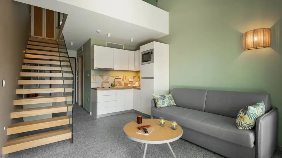 Smeštaj je koncipiran kao hotel-rezidencija, sa modernim studijima, apartmanima i većim apartmanima, osmišljenim za udoban boravak parova i porodica. Posebno se ističu prostranije jedinice na dva nivoa, pogodne za više osoba, kao i smeštaj sa čajnom kuhinjom za one koji vole veću nezavisnost tokom odmora. Hotel je kategorizovan kao 3 zvezdice i naglasak stavlja na savremeni komfor i urednost.