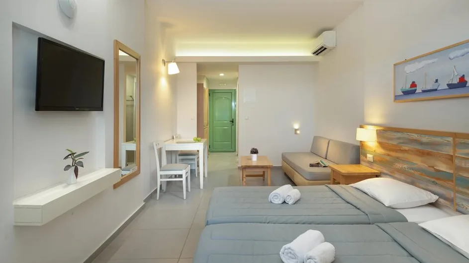 Od sadržaja, gostima su na raspolaganju spoljašnji bazen sa urednim prostorom za sunčanje, restoran koji poslužuje obroke inspirisane kritskom i mediteranskom kuhinjom, kao i bar pored bazena za osvežavajuće koktele tokom dana i uveče. Na organizovanoj plaži ispred hotela obezbeđene su ležaljke i suncobrani, a dostupni su i peškiri za plažu. Hotel nudi besplatan bežični internet u zajedničkim prostorijama i sobama, parking za goste, uslugu iznajmljivanja automobila, kao i manju teretanu za one koji žele da ostanu aktivni tokom odmora.