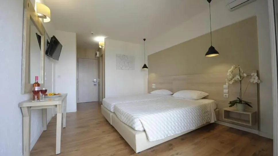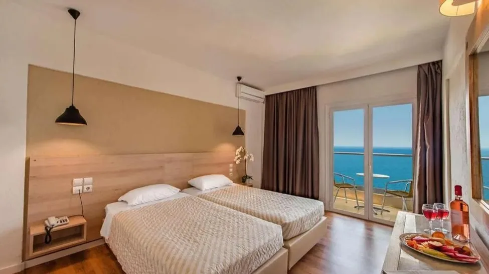 Hotel raspolaže različitim tipovima soba, od klasičnih dvokrevetnih sa pogledom na okolinu, preko soba sa bočnim pogledom na more, do porodičnih soba namenjenih većem broju gostiju. Sve smeštajne jedinice su moderno uređene i funkcionalne, sa klimom, sopstvenim kupatilom, balkonom ili terasom i bežičnim internetom. U zavisnosti od tipa, sobe mogu primiti parove, tročlane ili četvoročlane porodice, što Evia Riviera Resort čini pogodnim i za kraće i za duže boravke. Ukupni kapacitet hotela obuhvata veliki broj soba, što omogućava i prihvat većih grupa ili poslovnih gostiju.