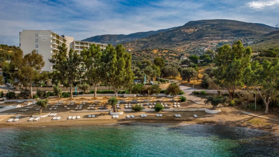 Evia Riviera Resort je moderno renovisan hotel sa 4 zvezdice, smešten u mirnom okruženju mediteranskog vrta, na ostrvu Evija u Centralnoj Grčkoj. Nalazi se u mestu Amarynthos, na svega oko 50 m od plaže, do koje se stiže praktičnim podzemnim prolazom direktno od bazena. Od centra Amarynthosa udaljen je približno 3 km, dok je grad Halkida, glavni grad ostrva, na oko 35 km vožnje. Duga šljunkovito–peščana plaža i pogled na Egejsko more čine hotel odličnim izborom za opuštajući odmor u Grčkoj.