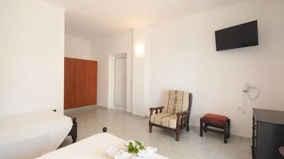 Hotel raspolaže sa oko četrdesetak funkcionalno uređenih soba, podeljenih u nekoliko osnovnih tipova, namenjenih smeštaju parova, porodica ili manjih grupa prijatelja. Sobe su jednostavno, ali ukusno opremljene, u toplim zemljanim tonovima, i poseduju balkon ili terasu sa pogledom na vrt, bazen ili okolinu. Svaka smeštajna jedinica ima kupatilo sa tušem, fen za kosu, klima-uređaj i frižider, dok su standardne dvokrevetne i trokrevetne sobe najzastupljenije opcije. Kapaciteti su prilagođeni gostima koji traže praktičan i povoljan smeštaj kao bazu za obilazak ostrva.