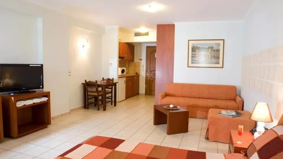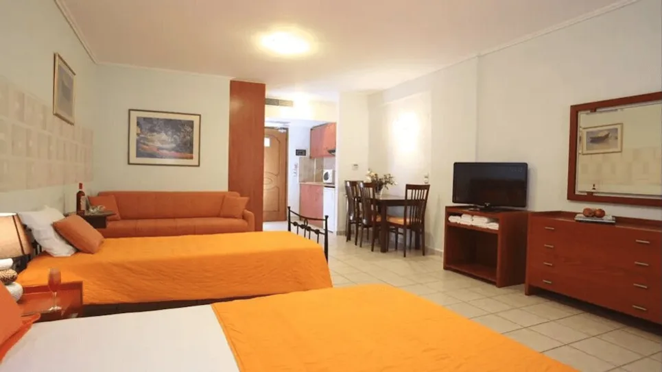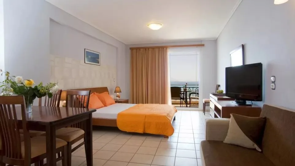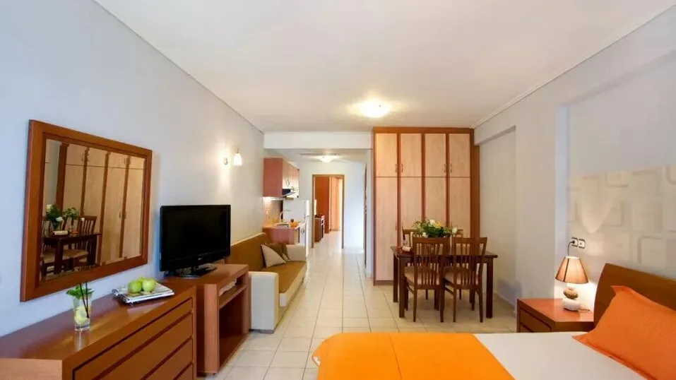 Smeštaj u hotelu je organizovan u moderno opremljenim sobama i apartmanima različitih tipova, prilagođenim parovima, porodicama i manjim društvima. Gostima su na raspolaganju standardne dvokrevetne sobe, prostrani studiji sa čajnom kuhinjom, kao i porodične sobe i dvoetažni apartmani koji mogu da ugoste više osoba, idealni za duži boravak. Sve jedinice su klimatizovane, većina ima balkon ili terasu sa pogledom na more ili planine, a opremljene su kupatilom, frižiderom, televizorom i bežičnim internetom.