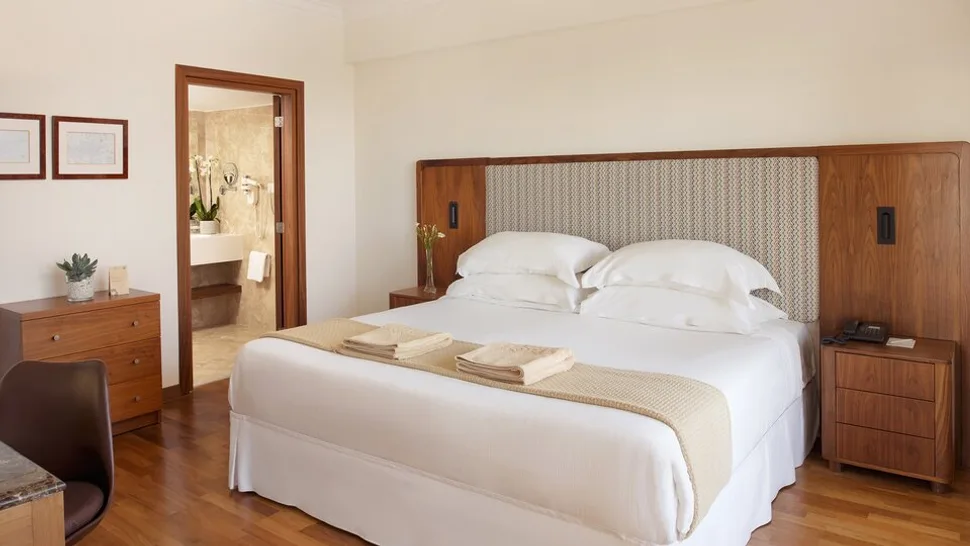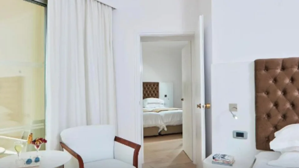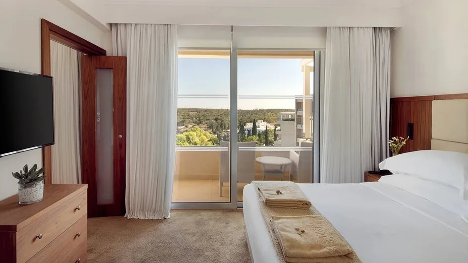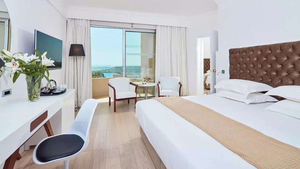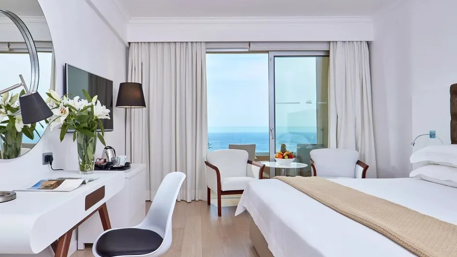 Hotel raspolaže sa oko 240 soba i apartmana, moderno uređenih u svetlim tonovima, sa balkonom i pogledom na more ili zelene baštenske površine. Standardne sobe primaju do tri osobe, dok veći apartmani nude dodatni prostor za porodice ili goste koji žele više komfora. Sve smeštajne jedinice imaju klima-uređaj, televizor sa satelitskim kanalima, bežični internet, mini-bar, set za pripremu kafe i čaja, kao i sef. Kupatila su opremljena fenom, bade-mantilima i papučama, a usluga pospremanja je na visokom nivou.