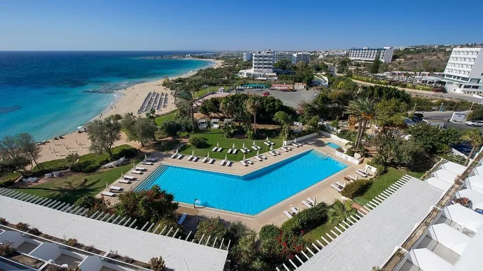 Grecian Sands Hotel je elegantan hotel sa 4 zvezdice, smešten na blagoj uzvišici iznad prelepe peščane plaže Grecian Bay u Ayia Napi, na Kipru, u Grčkoj. Okružen uređenim mediteranskim vrtovima, pruža mirnu atmosferu, a istovremeno je na svega oko 10 minuta hoda od centra Ayia Nape sa tavernama, prodavnicama i bogatim noćnim životom. Hotel se nalazi direktno na plaži, sa sopstvenim delom obale, ležaljkama i suncobranima, dok je aerodrom u Larnaki udaljen približno 30 minuta vožnje, što ga čini lako dostupnim za goste koji stižu avionom. ([booking.com](https://www.booking.com/hotel/cy/grecian-sands.html?utm_source=openai))