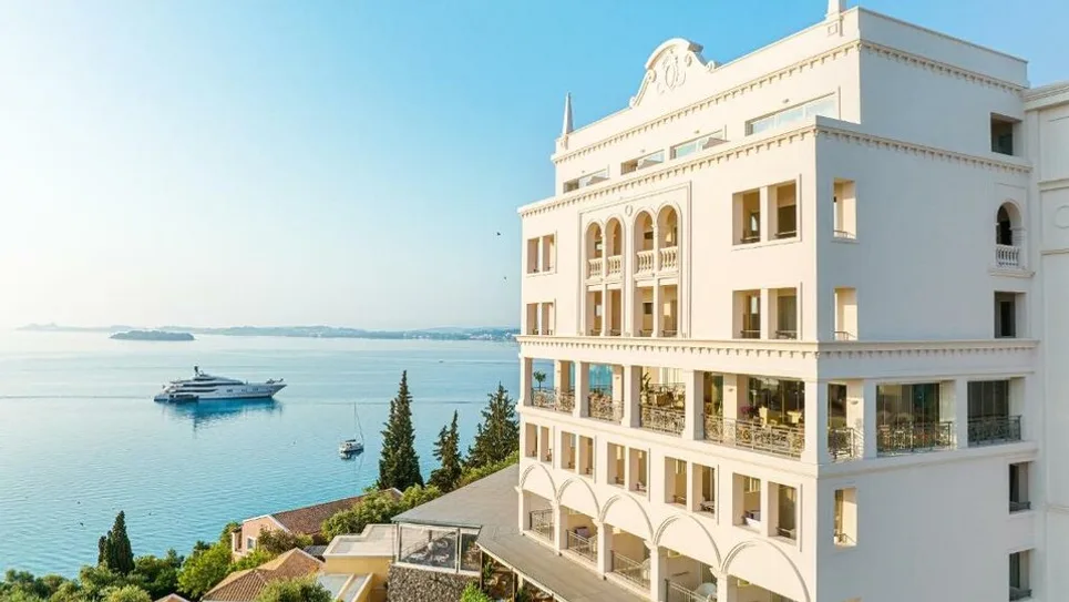 Grecotel Eva Palace je luksuzni hotel kategorije 5 zvezdica, smešten na ekskluzivnom poluostrvu Kommeno na Krfu, u Jonskim ostrvima u Grčkoj. Okružen bujnim čempresima, maslinjacima i egzotičnim vrtovima, hotel je blago uzdignut na padini, sa zadivljujućim panoramskim pogledom na Jonsko more i obližnja primorska sela. Nalazi se na svega oko 150 m od peščane plaže, do koje se stiže laganom šetnjom kroz vrtove. Istorijski grad Krf, pod zaštitom UNESCO-a, udaljen je približno 10–12 km, dok je međunarodni aerodrom Krf na oko 30–40 minuta vožnje, što čini hotel odličnom bazom za istraživanje ostrva. ([grecotel.com](https://www.grecotel.com/eva-palace/?utm_source=openai))