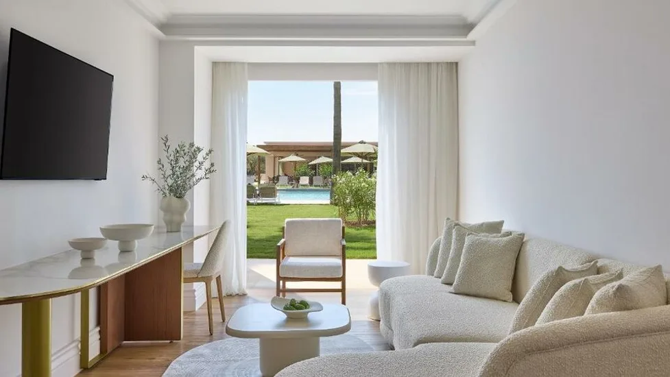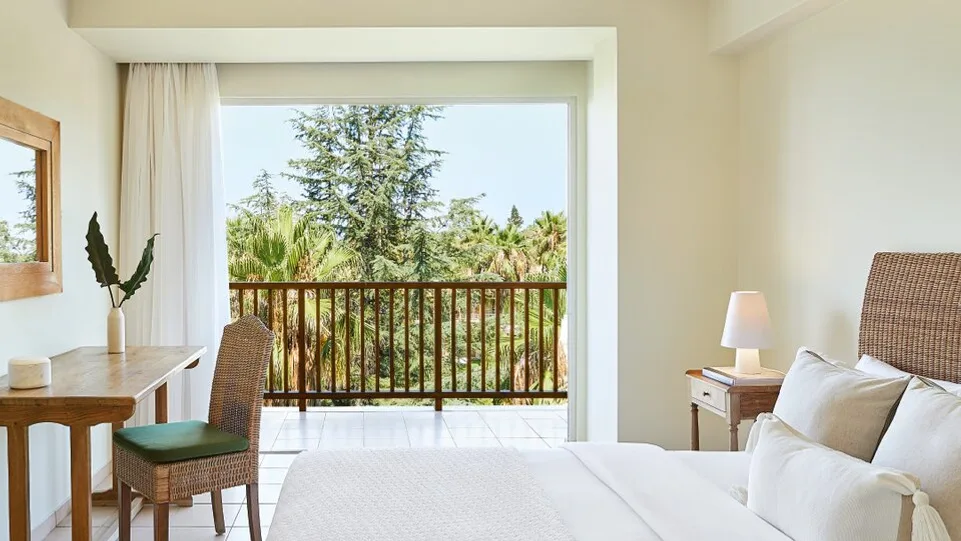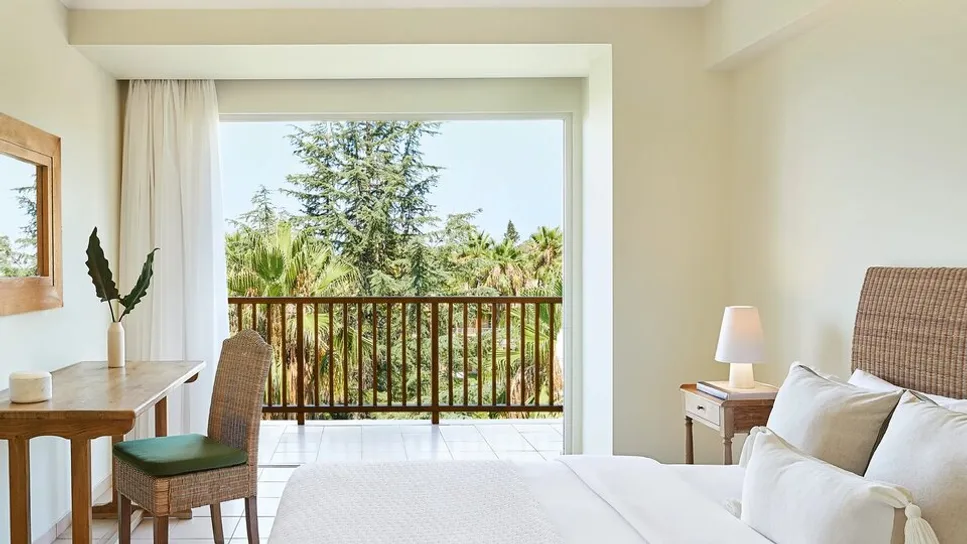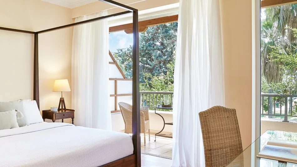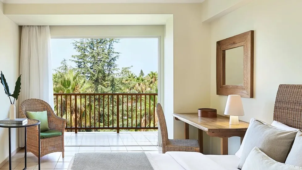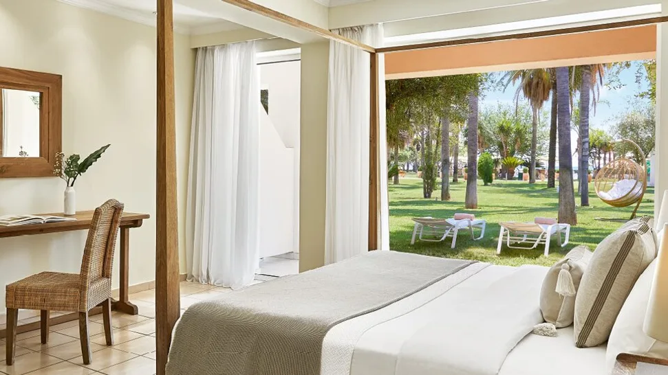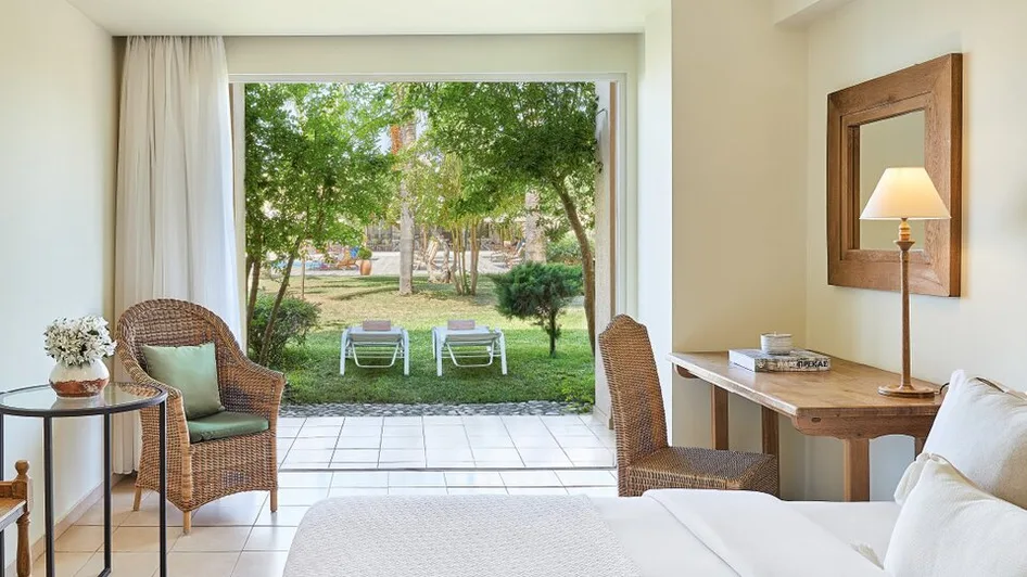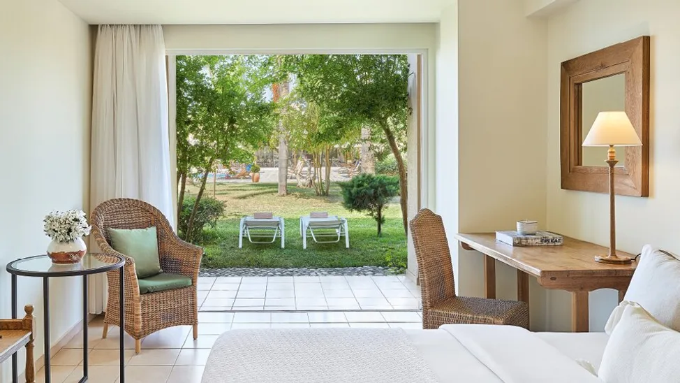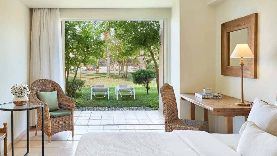 Hotel raspolaže sa oko 160 soba i apartmana, raspoređenih u zgradama okruženim negovanom baštom. Standardne i superior sobe nude pogled na more ili vrt, francuski ili dva odvojena ležaja, radni sto i moderno uređena kupatila od mermera, pogodna za smeštaj dvoje odraslih ili porodice sa jednim detetom. Veći apartmani obezbeđuju dodatni prostor sa dnevnim delom, što je idealno za porodice sa dvoje dece ili goste koji žele više komfora i privatnosti. Sve smeštajne jedinice su klimatizovane, imaju bežični internet, televizor sa satelitskim kanalima, mini bar i balkon ili terasu, stvarajući osećaj prijatne mediteranske rezidencije. ([grecotel.com](https://www.grecotel.com/filoxeniakalamata/?utm_source=openai))