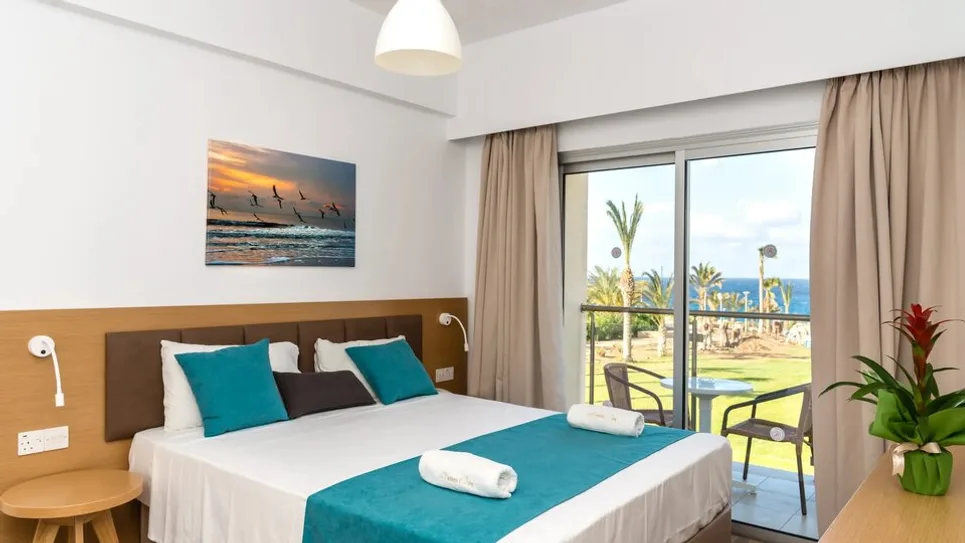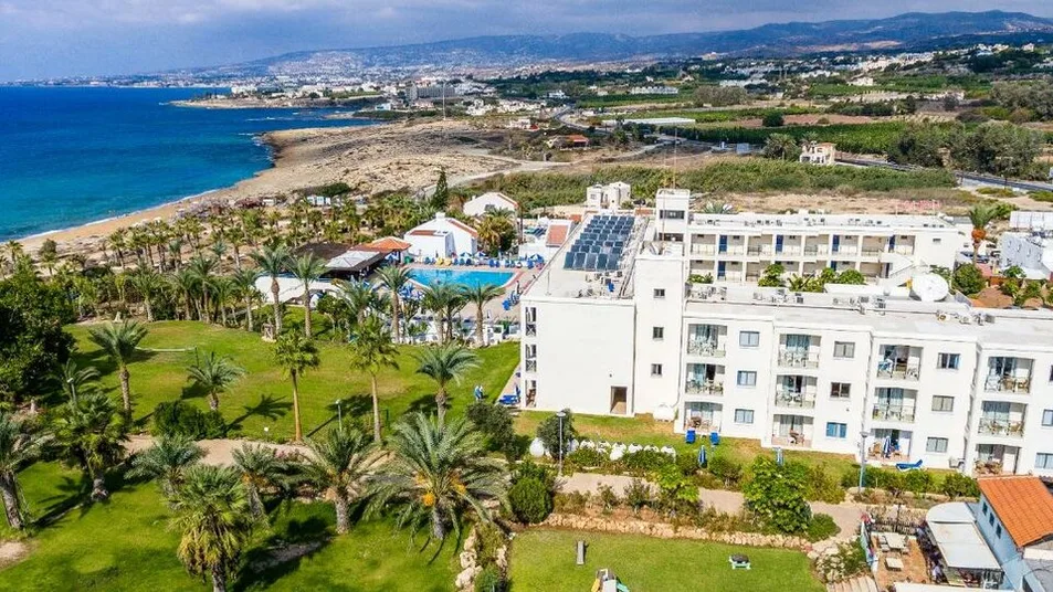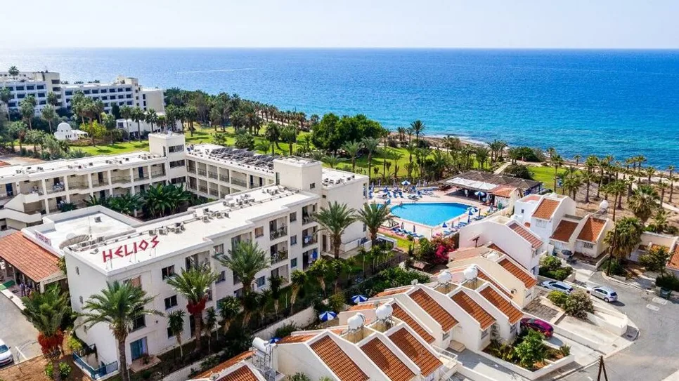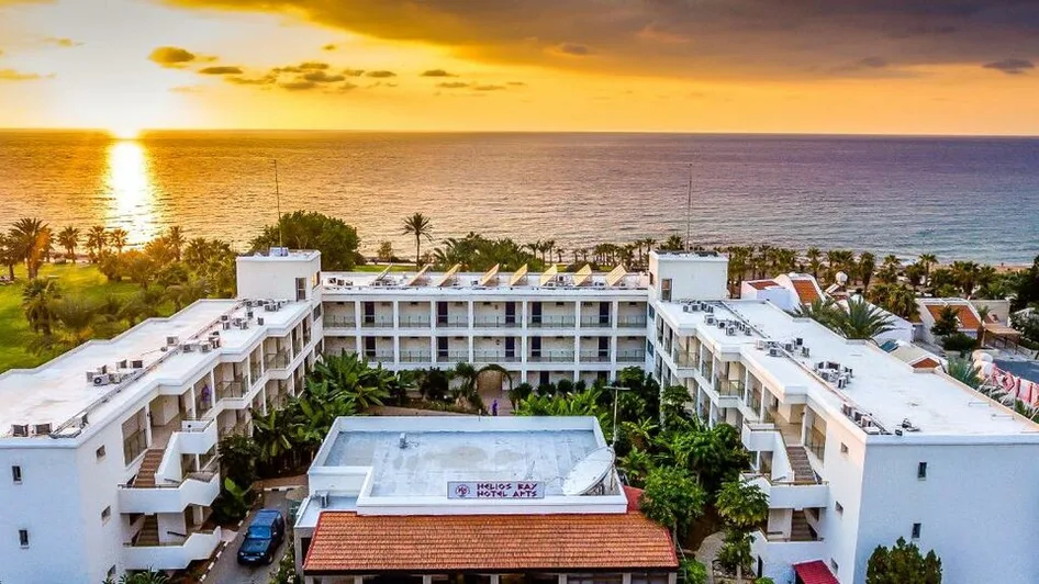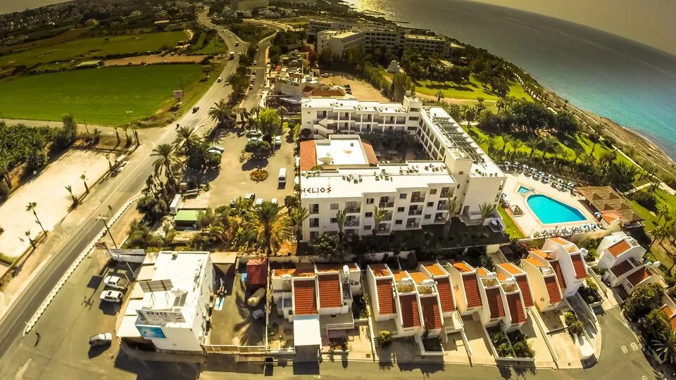 Helios Bay Hotel and Suites je porodični hotel sa 3 zvezdice, smešten u mirnom turističkom delu Pafosa, na jugozapadnoj obali Kipra, u Grčkoj. Nalazi se između zaliva Coral Bay i arheološki poznatog područja Tombs of the Kings, direktno uz obalu, na svega oko 100 m od peščane plaže, do koje se stiže kratkom šetnjom kroz lepo uređeno dvorište. Ispred hotela je šetalište uz more, dok su prodavnice, taverne i barovi dostupni na nekoliko minuta hoda. Centar Pafosa je udaljen oko 4 km, a do aerodroma Pafos ima približno 13 km, što ga čini lako dostupnim transferom ili taksijem. ([helioshotelpaphos.com](https://www.helioshotelpaphos.com/?utm_source=openai))