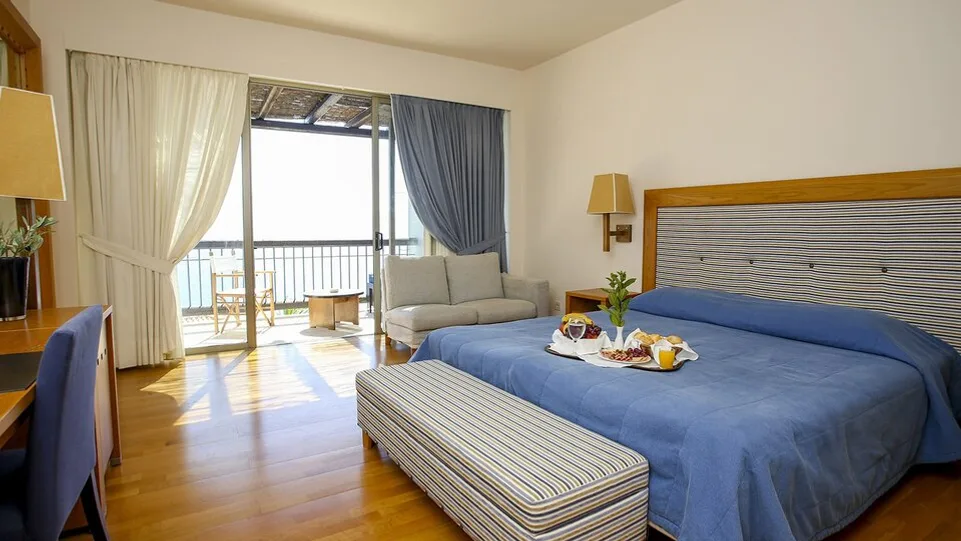 Smeštaj u hotelu Ionian Blue organizovan je u glavnoj zgradi i bungalovima, sa ukupno oko 116 soba različitih tipova. Standardne i superior sobe elegantno su uređene, sa klima-uređajem, televizorom, mini barom, kupatilom sa kadom ili tušem i balkonom ili terasom sa garniturom za sedenje, najčešće sa direktnim ili bočnim pogledom na more. Veći apartmani su prostraniji i idealni za porodice ili parove koji žele dodatni komfor, dok pojedine jedinice mogu ugostiti i do tri ili četiri osobe, u zavisnosti od konfiguracije ležajeva.