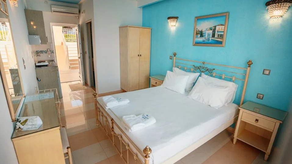 Objekat nudi moderno uređene studije i apartmane, idealne za parove i porodice. Smeštajne jedinice su svetle i prostrane, sa podovima od pločica i detaljima od kovanog gvožđa, većinom sa balkonom ili terasom i pogledom na more ili baštu. Na raspolaganju su standardni studiji za 2–3 osobe, kao i porodični apartmani sa odvojenim prostorom za spavanje, pogodni za duži boravak. Sve jedinice imaju čajnu kuhinju sa frižiderom, što omogućava gostima da sami pripremaju lagane obroke, kao i moderno kupatilo sa fenom za kosu, klima-uređaj, sef i televizor.