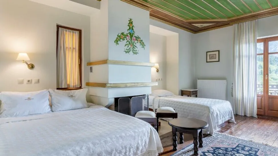 Hotel raspolaže sa oko 20–25 smeštajnih jedinica, uređenih u tradicionalnom epirotskom stilu, sa drvenim podovima, tavanicama i toplim bojama. Gosti mogu birati standardne dvokrevetne sobe, prostranije porodične sobe, kao i elegantne apartmane sa dnevnim boravkom i kaminom, pogodne za romantični boravak ili duži odmor. Većina soba ima balkon sa pogledom na planine ili dolinu, a kapaciteti su prilagođeni parovima, manjim grupama prijatelja i porodicama sa decom.