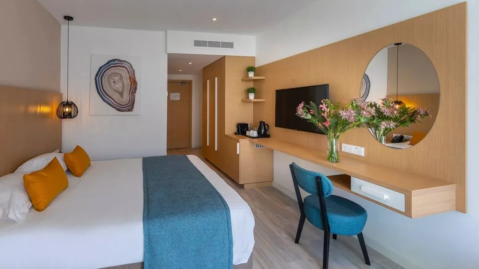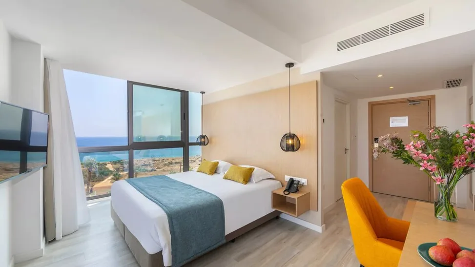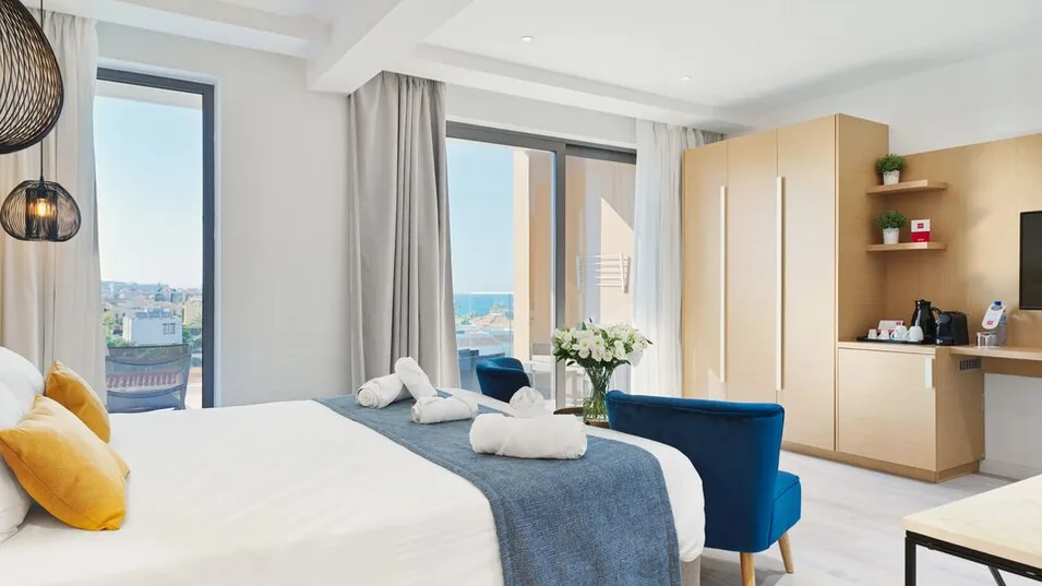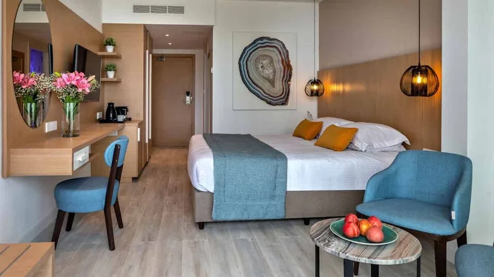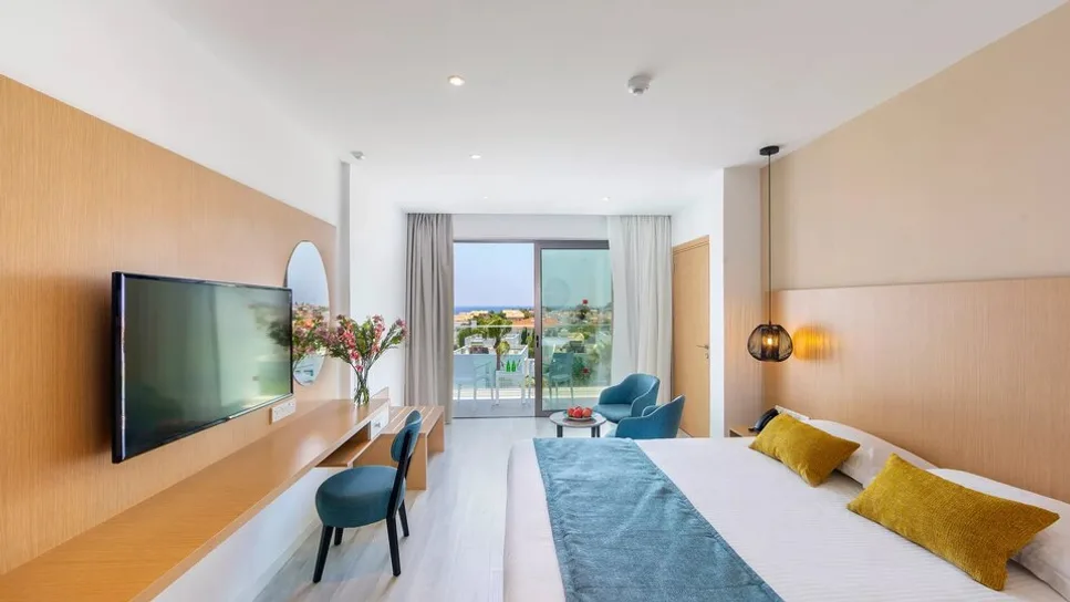 Hotel raspolaže sa oko 120 soba i apartmana, uređenih u modernom, mediteranskom stilu, sa svetlim tonovima i akcentima u tirkiznoj boji. Gostima su na raspolaganju dvokrevetne sobe sa pogledom na kopno ili more, prostranije studijske sobe, kao i veći apartmani sa hidromasažnom kadom na terasi, idealni za romantične boravke. Deo smeštaja nudi spojene sobe i opcije pogodne za više osoba, dok su pojedine jedinice prilagođene gostima sa otežanim kretanjem, uz sve neophodne sadržaje za udoban boravak.