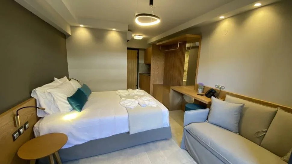 Smeštaj u objektu Lithos Suites organizovan je u modernim apartmanima tipa apart–hotel, sa ukupno 11 apartmana, idealno osmišljenih za 2 do 4 osobe. Svaka jedinica ima spavaću sobu sa francuskim ležajem, dnevni boravak sa sofom na razvlačenje, kupatilo sa tušem i terasu ili balkon. Gostima su na raspolaganju potpuno opremljene čajne kuhinje sa frižiderom, pločom za kuvanje, posuđem i električnim kuvalom, što je naročito pogodno za porodice sa decom i one koji vole da sami pripremaju obroke. Sve jedinice su klimatizovane, imaju televizor ravnog ekrana i bežični internet, što obezbeđuje udobnost i tokom dužih letnjih odmora.