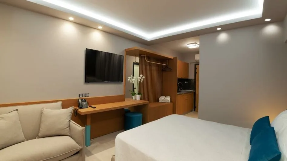 Od sadržaja, Lithos Suites raspolaže prijatnim spoljnim bazenom sa ležaljkama i suncobranima, idealnim za celodnevno uživanje i predah posle plaže. U okviru kompleksa se nalaze recepcija, lift, kao i sopstveni parking. Gostima su na raspolaganju besplatan bežični internet u zajedničkim prostorijama i u sobama, bankomat i mogućnost usluga lekara na poziv, što pruža dodatnu sigurnost tokom boravka. U blizini se nalaze razne prodavnice i uslužni objekti, tako da gosti lako mogu da obave kupovinu namirnica ili suvenira.