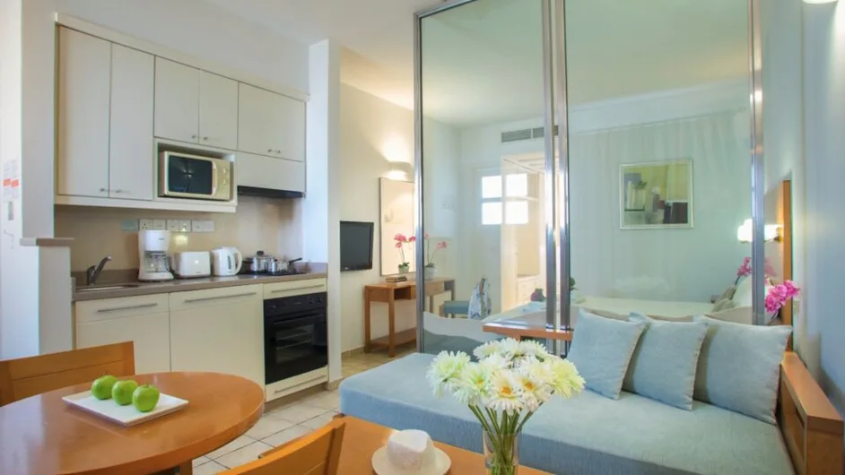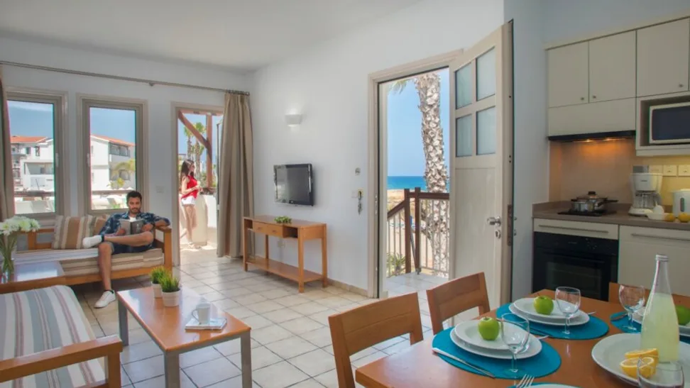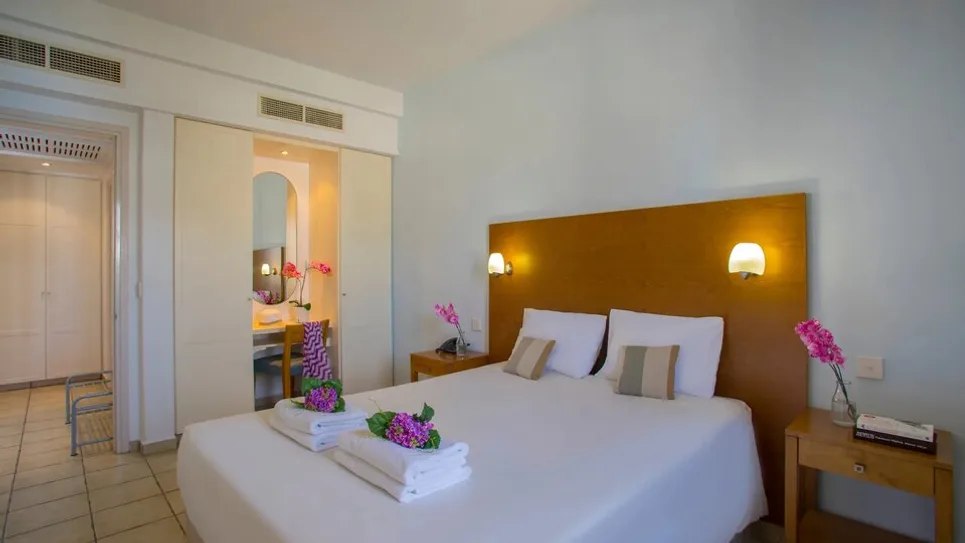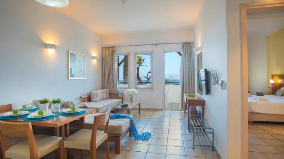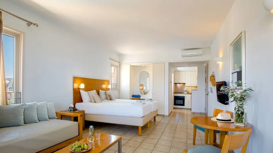 Smeštaj u hotelu čine prostrani studiji i apartmani različitih veličina, idealni za parove i porodice. Studio sobe (oko 32 m²) primaju do tri osobe i imaju balkon ili terasu sa pogledom na baštu, bazen ili more. Jednosobni apartmani su komforniji, predviđeni za do četiri osobe, dok dvosobni apartmani površine oko 62 m² mogu ugostiti do šest osoba, što ih čini odličnim izborom za veće porodice ili društvo prijatelja. Sve jedinice imaju čajnu kuhinju, frižider, klima-uređaj, sef, televizor i besplatan bežični internet, a deo kapaciteta prilagođen je osobama sa smanjenom pokretljivošću. Ukupno, hotel raspolaže sa prostranim porodičnim smeštajem koji nudi osećaj apartmanskog komfora uz hotelske usluge.
