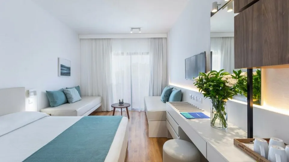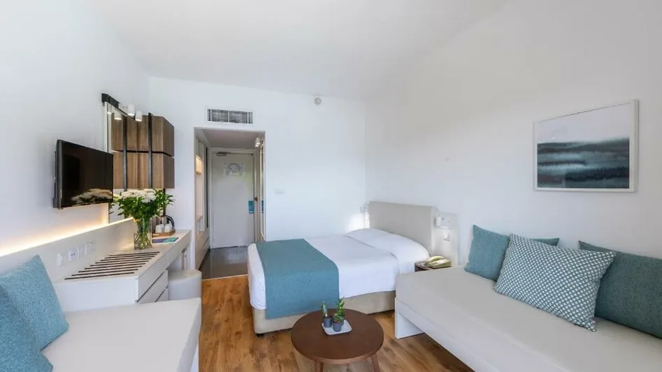 Hotel raspolaže sa oko 420 soba, raspoređenih u glavnoj zgradi, većina sa balkonom ili terasom i delimičnim ili direktnim pogledom na more ili vrt. Standardne dvokrevetne sobe primaju 2–3 osobe, dok porodične sobe i veći apartmani omogućavaju udoban smeštaj za roditelje sa dvoje dece, uz mogućnost pomoćnih ležajeva ili sofa kreveta. Sve smeštajne jedinice su moderno i funkcionalno uređene, sa kupatilom, klimom, televizorom, mini frižiderom i sefom (uz doplatu), što obezbeđuje komforan boravak kako parovima, tako i porodicama.