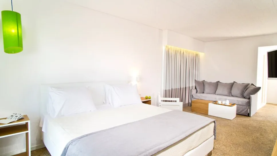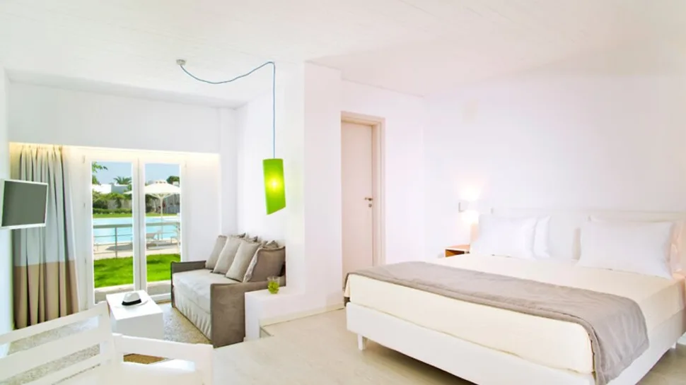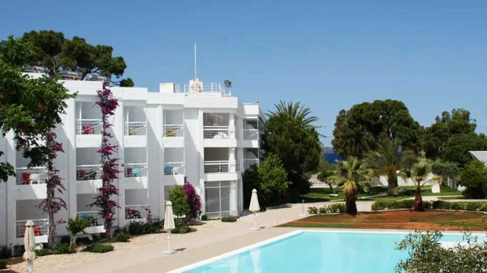 Hotel raspolaže sa ukupno 74 sobe, raspoređene u nekoliko zgrada okruženih mediteranskim vrtom sa palmama i bugenvilijama. Gostima su na raspolaganju standardne dvokrevetne i superior sobe, kao i prostraniji apartmani za tri ili četiri osobe, uključujući porodične apartmane sa odvojenim delom za decu. Sve smeštajne jedinice imaju klima-uređaj, televizor sa satelitskim kanalima, telefon, mini-bar ili frižider, kupatilo sa toaletnim priborom i fenom, kao i balkon ili terasu sa pogledom na more, vrt ili bazen. Po zahtevu je moguće dobiti dečji krevetac, a pojedine sobe mogu primiti pomoćni ležaj. ([marathonbeachresort.com](https://www.marathonbeachresort.com/accommodation/?utm_source=openai))