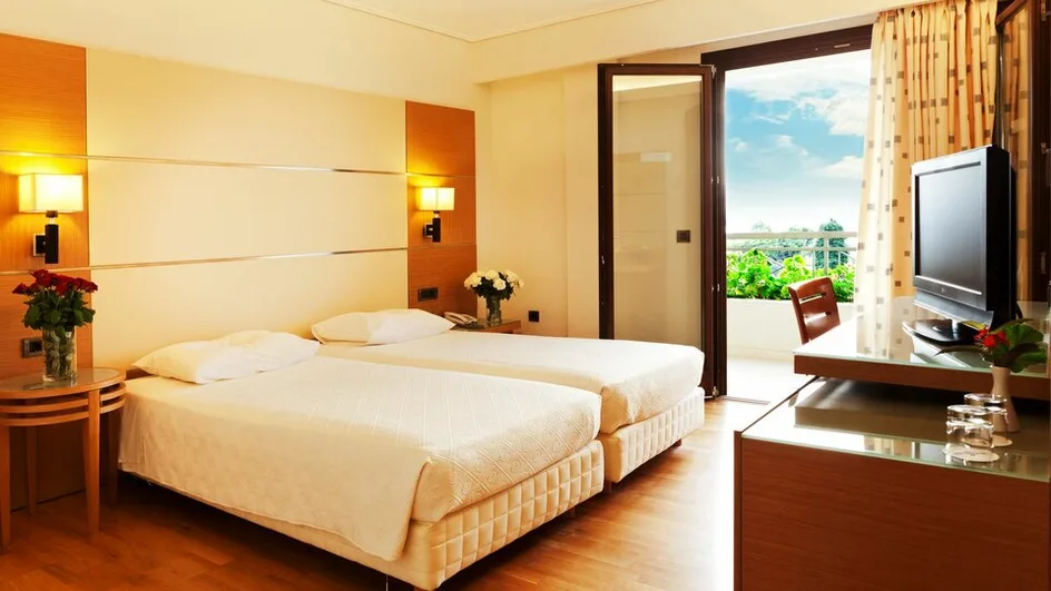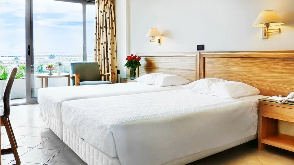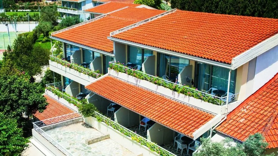 Ovaj prijatan kompleks kategorije 4 zvezda nudi smeštaj u glavnoj zgradi i depandansama okruženim baštom. Standardne dvokrevetne sobe, kao i sobe u depandansi, primaju do tri osobe, pa su pogodne za parove ili manje porodice. Moderno uređeni apartmani, izgrađeni 2020. godine, imaju oko 55 m², dve spavaće sobe, potpuno opremljenu kuhinju i terasu, što ih čini odličnim izborom za veće porodice ili duži boravak. Sobe poseduju klima-uređaj, sef, frižider, balkon ili terasu, a većina ima bočni pogled na more ili bujni vrt.