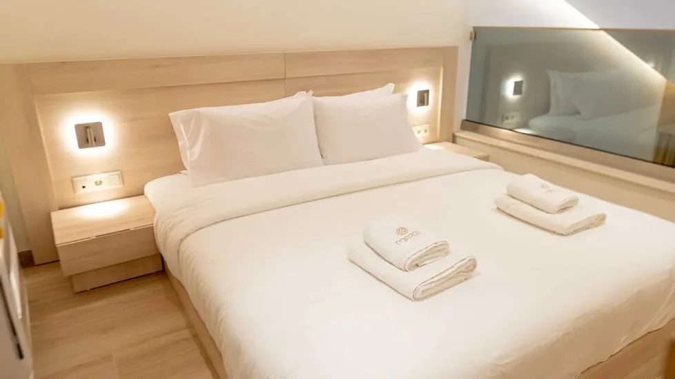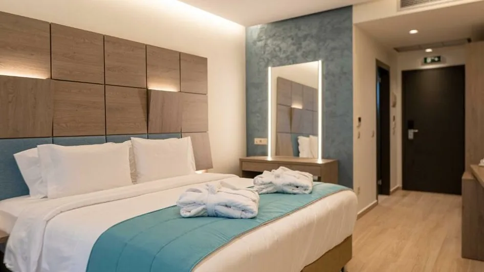 Smeštaj u hotelu Mirror organizovan je u moderno uređenim sobama raspoređenim oko bazena. Gostima su na raspolaganju standardne dvokrevetne sobe i superior sobe, koje nude francuski ležaj i pomoćni ležaj ili sofu, pa mogu da prime parove ili manje porodice. Ukupno je dostupno oko 35 modernih soba, uključujući i prostranije apartmane za zahtevnije goste. Sve smeštajne jedinice imaju klima-uređaj, balkon ili terasu, televizor, sef, mini frižider, kupatilo sa tušem, fen za kosu, kao i pribor za pripremu kafe i čaja, što obezbeđuje komforan boravak i za duže odmore. ([mirrorhotel.gr](https://www.mirrorhotel.gr/about-us/?utm_source=openai))