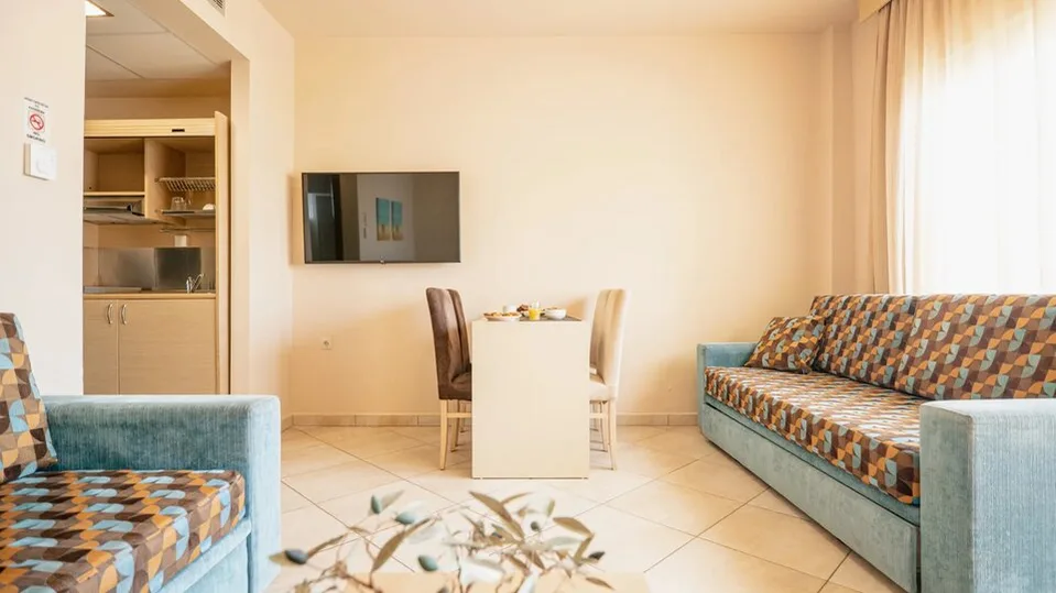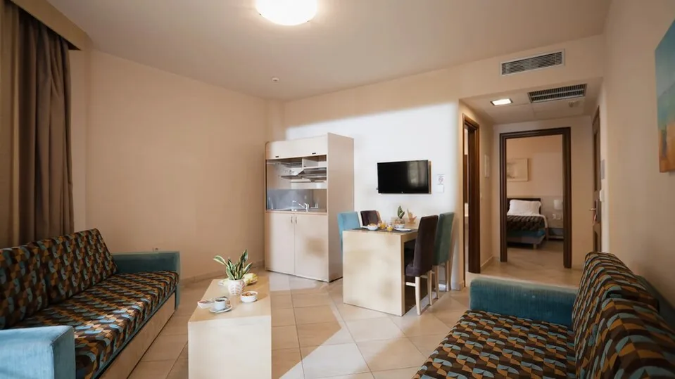 Hotel raspolaže sa ukupno 45 smeštajnih jedinica, pretežno prostranih apartmana i većih apartmana sa pogledom na more ili na lepo uređen vrt. Sobe su moderno uređene, klimatizovane, sa balkonom ili terasom, mini frižiderom, televizorom sa satelitskim kanalima i kupatilom sa kadom ili tuš kabinom. Porodice će posebno ceniti apartmane sa dnevnim boravkom i odvojenom spavaćom sobom, koji pružaju dodatnu udobnost i privatnost, dok su dvokrevetne sobe odličan izbor za parove koji traže udoban i prijatan smeštaj nadomak plaže.