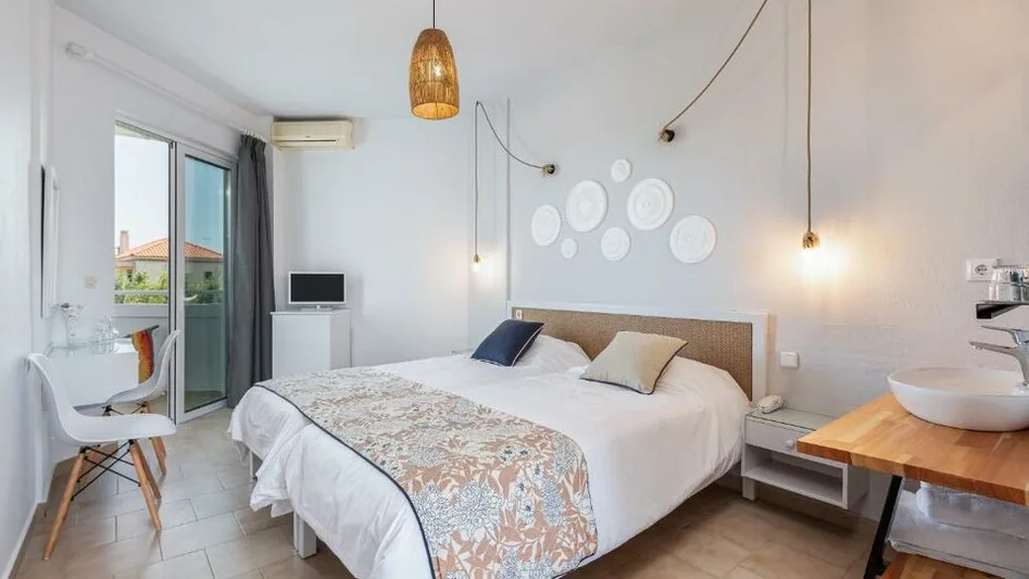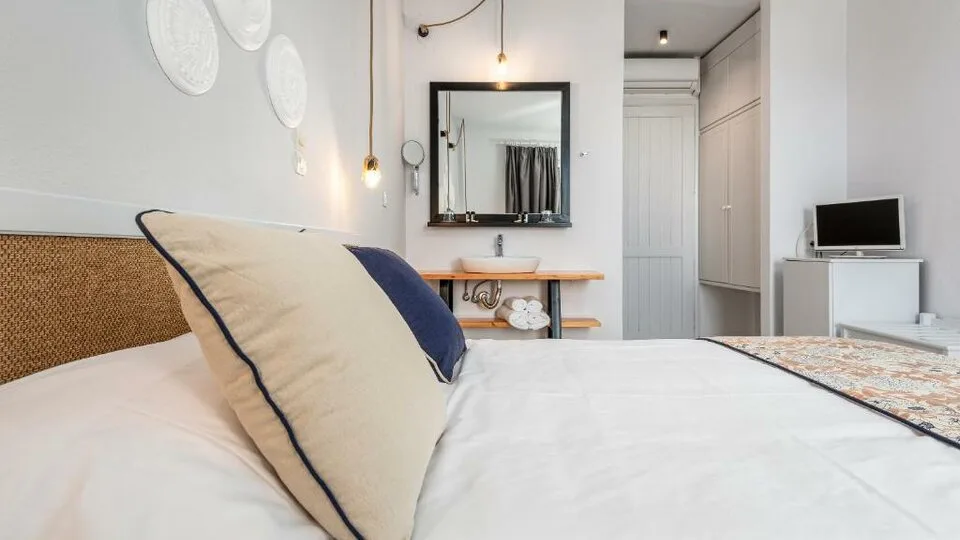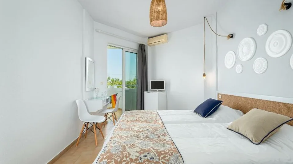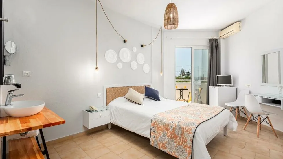 Smeštaj u hotelu organizovan je u ukusno uređenim, svetlim sobama minimalističkog stila, u belim i plavim tonovima. Gosti mogu birati između standardnih dvokrevetnih soba, soba sa pogledom na more ili baštu, kao i praktičnih povezanih jedinica koje su pogodne za porodice. Većina soba ima balkon ili terasu, klima-uređaj, televizor, frižider i moderno kupatilo sa tušem. Ukupan kapacitet hotela je relativno mali, sa oko 30–45 soba, što doprinosi intimnoj i mirnoj atmosferi boravka.