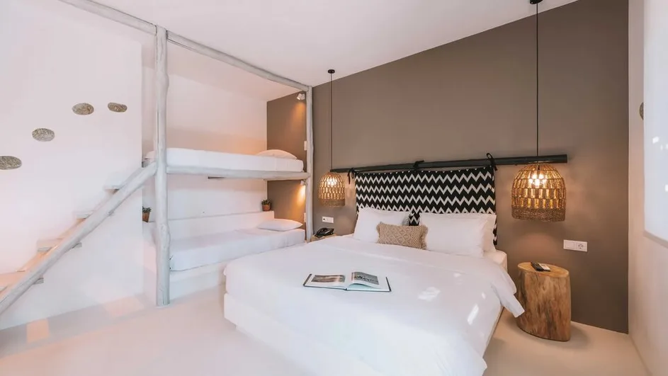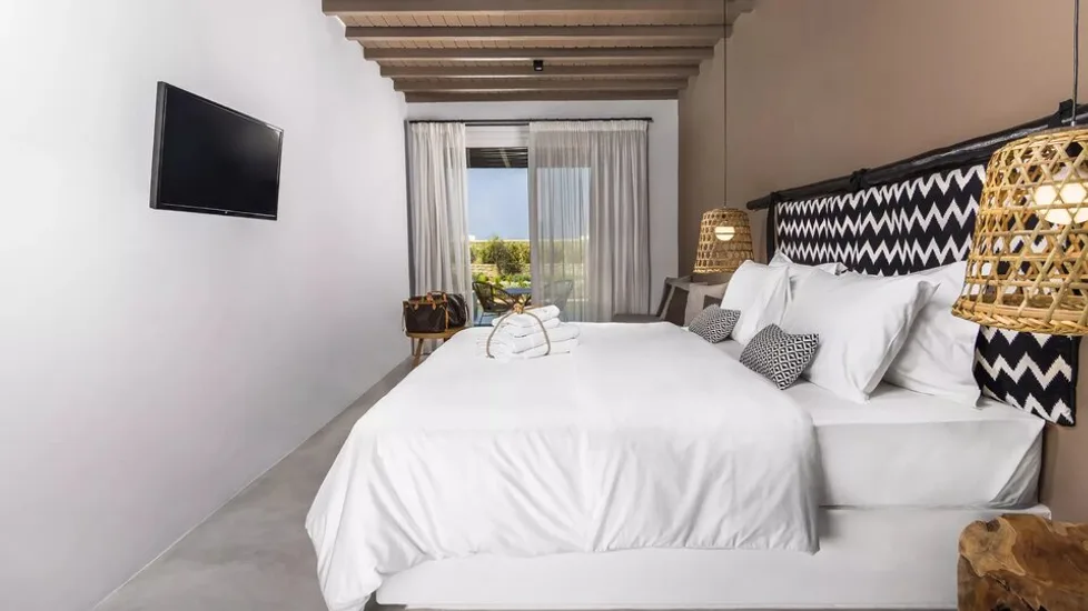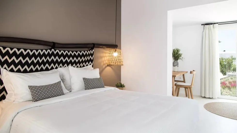 Smeštajne jedinice su moderno uređene u boho i tradicionalnom kikladskom stilu, sa naglaskom na prirodne materijale i svetle tonove. Hotel nudi standardne i superior dvokrevetne sobe, kao i prostranije apartmane, od kojih mnogi imaju balkon ili terasu sa pogledom na more ili grad. Sve sobe su klimatizovane, opremljene savremenom tehnikom, mini-barom i sefom, a moderno kupatilo sadrži kvalitetnu kozmetiku, bade-mantile i papuče, što boravak čini posebno udobnim kako za parove, tako i za manje porodice. ([mymykonoshotel.gr-mykonos.com](https://mymykonoshotel.gr-mykonos.com/?utm_source=openai))