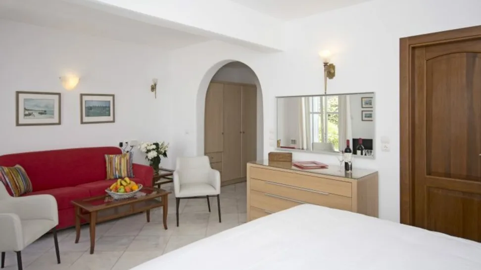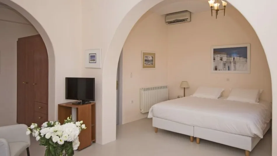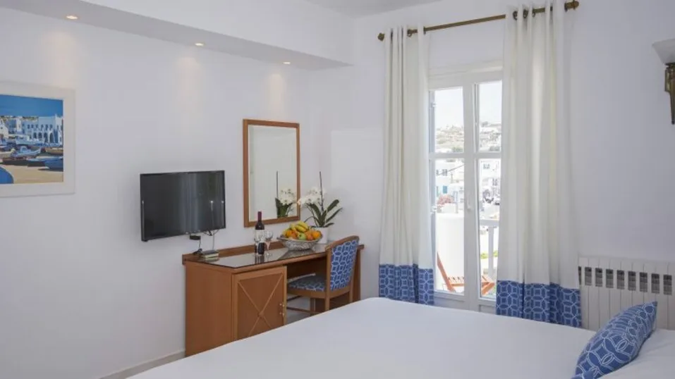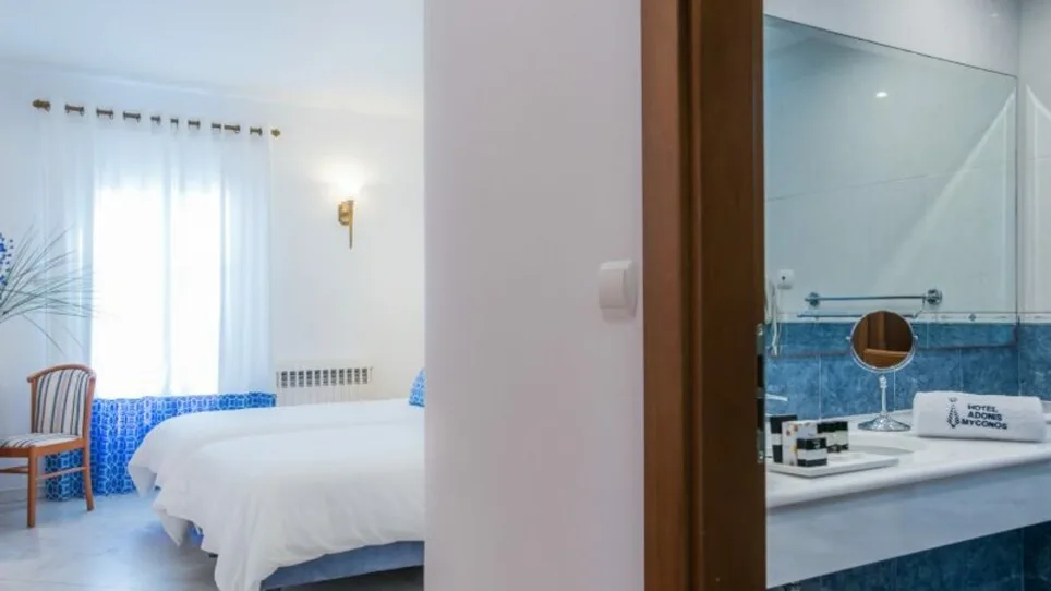Smeštaj u hotelu Mykonos Adonis organizovan je u udobnim i lepo uređenim sobama različitih tipova, pogodnim kako za parove, tako i za manje porodice. Gostima su na raspolaganju standardne dvokrevetne i trokrevetne sobe, kao i prostraniji apartmani sa dodatnim sadržajima i više prostora za boravak. Sve smeštajne jedinice su klimatizovane, imaju sopstveno kupatilo, televizor, mini-bar i balkon ili terasu, od kojih mnogi nude delimičan ili direktan pogled na more ili grad. U sobama je obezbeđen besplatan bežični internet, što posebno pogoduje gostima koji žele da ostanu povezani tokom odmora.