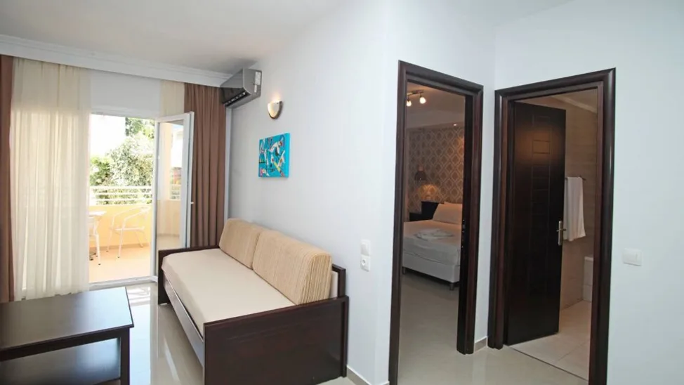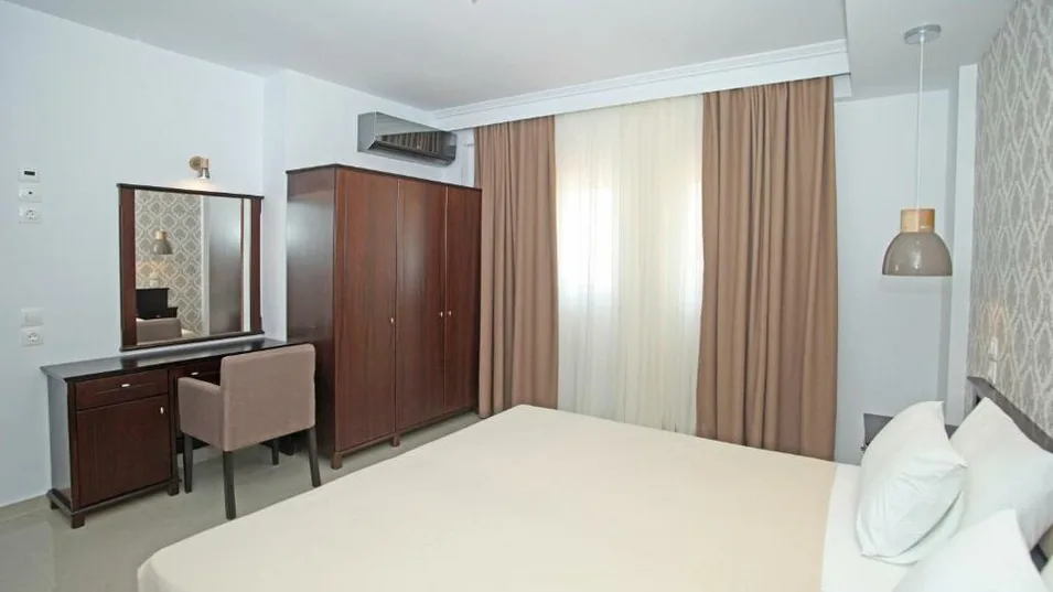 Smeštaj u hotelu Naias organizovan je u prostranim studijima i apartmanima, raspoređenim u dva objekta povezana podzemnim prolazom. Ukupno je oko 65 smeštajnih jedinica, većina sa pogledom na uređene bašte ili more. Studiji su idealni za parove ili manje porodice, sa jednim francuskim ili dva odvojena ležaja i pomoćnim ležajem, dok apartmani nude odvojenu spavaću sobu i dnevni boravak, što ih čini odličnim izborom za porodice sa dvoje ili troje dece. Sve jedinice imaju klima-uređaj, čajnu kuhinju, frižider, telefon, televizor, sef i kupatilo sa kadom ili tušem.