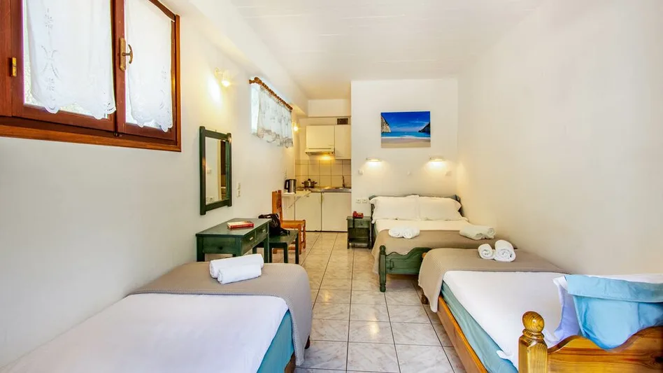 Ovaj manji, porodični hotel kategorije 2 zvezde raspolaže sa ukupno 20 soba, od kojih su 4 studija sa kuhinjom, dok su ostale komforne dvokrevetne i trokrevetne sobe. Sobe su uređene u jednostavnom, tradicionalnom jonskom stilu, sa drvenim detaljima i toplim bojama. Svaka smeštajna jedinica ima kupatilo sa tušem, klima-uređaj, televizor sa satelitskim kanalima, mini frižider, sef, telefon, bežični internet i balkon ili terasu, sa pogledom na baštu hotela ili živopisnu pešačku ulicu. Studiji su posebno pogodni za parove ili manje porodice koje žele mogućnost samostalne pripreme obroka.