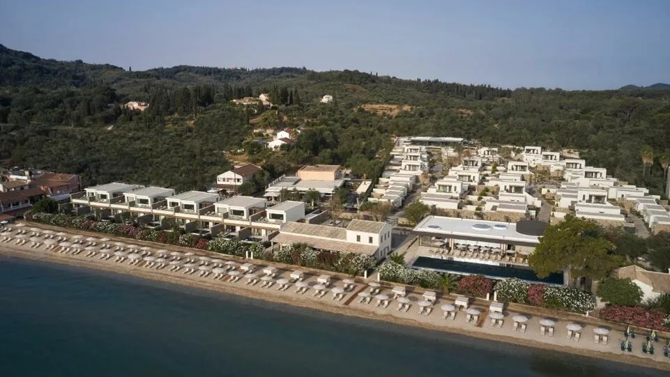 Built in an olive grove (27.000m2) of more than 300 years old at the beautiful scenery of the Corfiot south east coast, on the beach of Messonghi, 20km from Corfu airport and 22 km from Corfu town.
