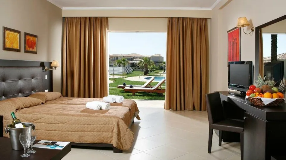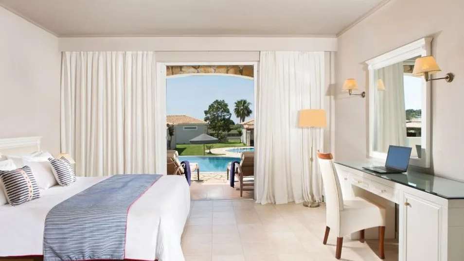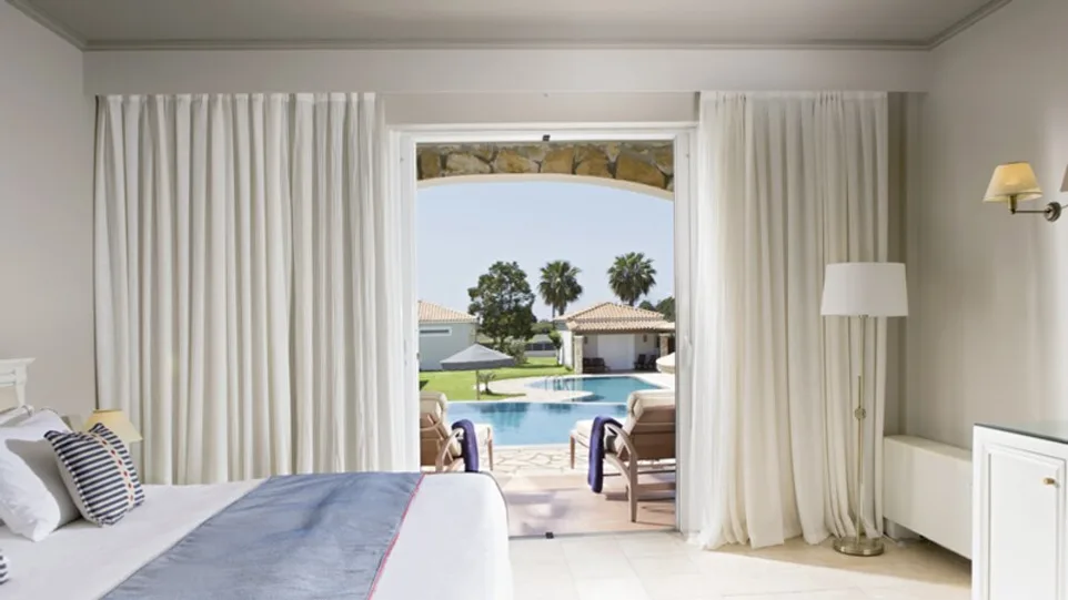 Smeštaj u hotelu obuhvata prostrane dvokrevetne sobe u glavnoj zgradi, elegantne bungalove, porodične sobe i apartmane, kao i luksuzne vile sa sopstvenim bazenom. Ukupno ima oko 50–60 smeštajnih jedinica, pažljivo uređenih u modernom mediteranskom stilu, sa balkonima ili terasama okrenutim ka vrtu ili bazenu. Pojedine jedinice nude direktan pristup zajedničkom bazenu, što je idealno za goste koji žele dodatnu dozu privatnosti i komfora. Sobe su klimatizovane, opremljene savremenom tehnikom, bogatom kozmetikom i svim detaljima za udoban boravak, uključujući bade-mantile, papuče i peškire za bazen i plažu. ([ogb.gr](https://ogb.gr/en/accommodation/deluxe-bungalow-sharing-pool?utm_source=openai))