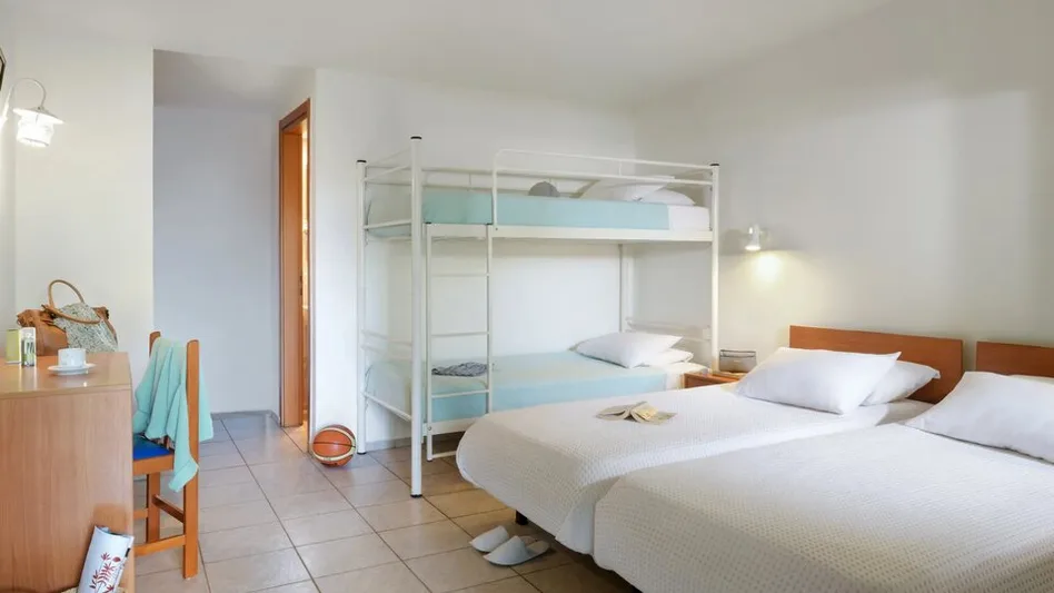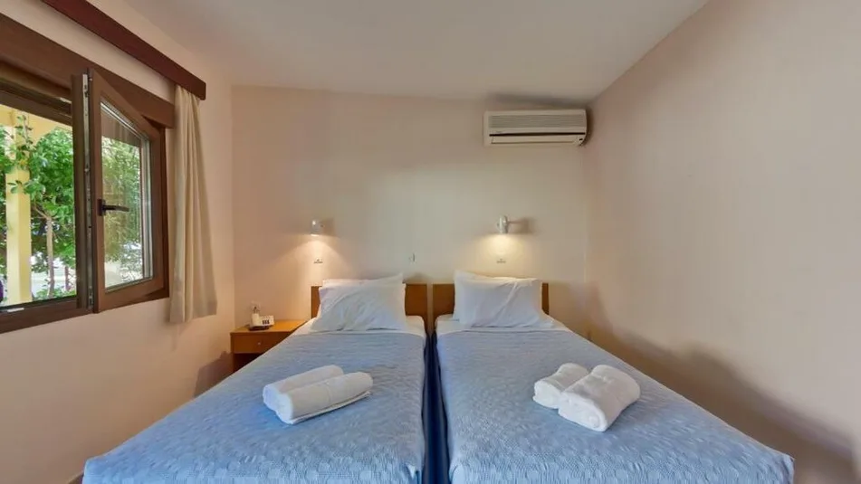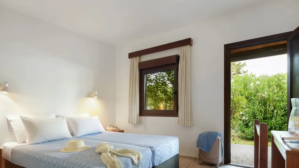 Smeštaj je organizovan u niskim bungalovima raspoređenim u prostranoj bašti, što gostima pruža osećaj privatnosti i odmora u prirodi. Hotel raspolaže različitim tipovima soba – dvokrevetnim, trokrevetnim i porodičnim sobama, kao i većim apartmanima, pogodnim za smeštaj roditelja sa decom. Sve sobe su klimatizovane, imaju sopstveno kupatilo sa tušem ili kadom, frižider, televizor i terasu ili mali dvorišni prostor sa pogledom na baštu ili dvorište. Mirno okruženje i dobra zvučna izolacija doprinose kvalitetnom snu i potpunom odmoru.