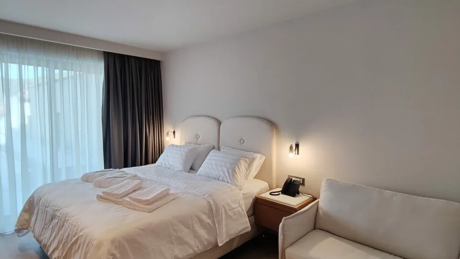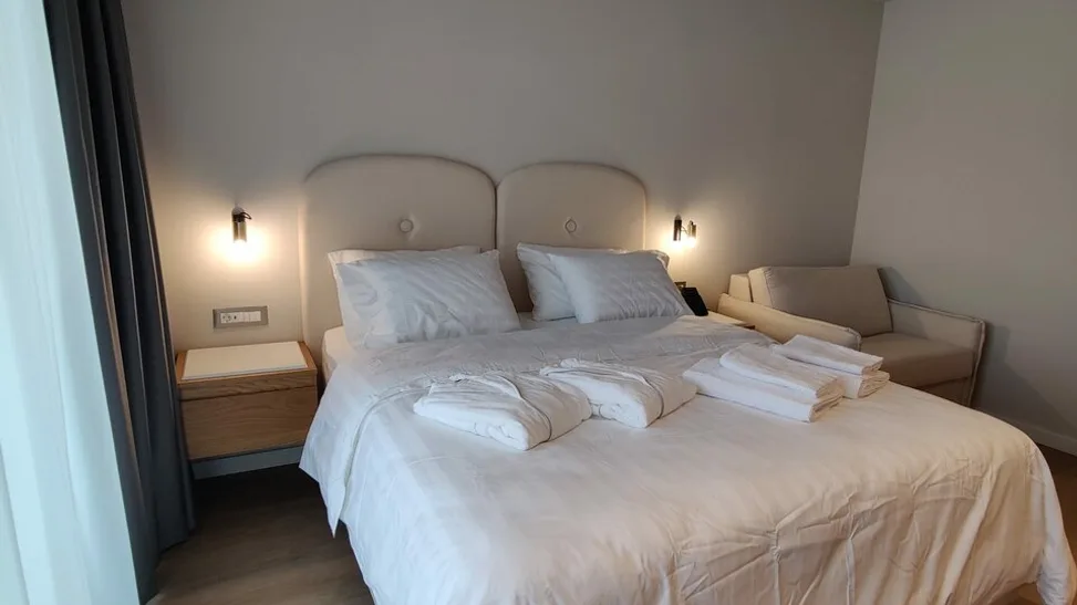 Hotel raspolaže moderno uređenim sobama i apartmanima, pogodnim za parove, porodice i manje grupe. Sve smeštajne jedinice su klimatizovane i imaju balkon, sopstveno kupatilo sa tušem, fenom i besplatnim toaletnim priborom, kao i televizor ravnog ekrana, sef i aparat za kafu. Deo smeštaja nudi prelep pogled na more ili bazen, dok ostale sobe gledaju na mirno dvorište. Ukupan broj jedinica je relativno mali, što doprinosi intimnoj, butik atmosferi, a raspored kreveta i mogućnost dodatnih ležajeva omogućavaju udoban boravak i porodicama sa decom.