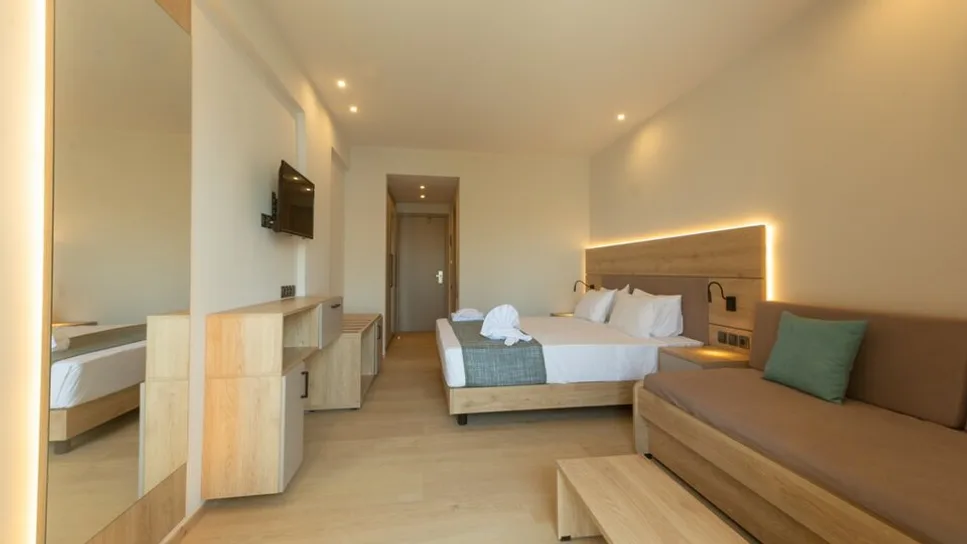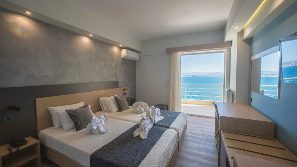 Hotel raspolaže komfornim standard, superior i deluxe sobama, većinom sa balkonom i pogledom na more ili planinu. Sobe su klimatizovane, sa sopstvenim kupatilom, televizorom i frižiderom, a pojedine jedinice mogu ugostiti i do tri ili četiri osobe, što ih čini pogodnim za porodice sa decom. Ukupno oko 100 soba nudi dobar odnos cene i kvaliteta, uz naglasak na čistoću i urednost. Moderne, renovirane sobe sa pogledom na more posebno su tražene među parovima koji žele romantičan ambijent i nezaboravne zalaske sunca iz sopstvenog balkona.