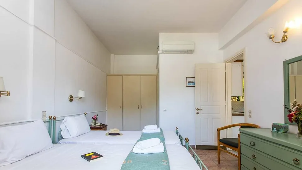 Hotel se sastoji od nekoliko manjih zgrada i nudi ukupno oko 20 soba i 3 apartmana, uređenih u jednostavnom mediteranskom stilu, sa detaljima od kovanog gvožđa i drveta. Standardne dvokrevetne sobe mogu primiti dve do tri osobe, dok su apartmani idealni za porodice ili duže boravke, jer nude više prostora i funkcionalan raspored. Sve smeštajne jedinice imaju klima-uređaj, televizor sa satelitskim kanalima, frižider, kupatilo sa tušem i balkon ili terasu sa pogledom na vrt ili okolnu šumu.