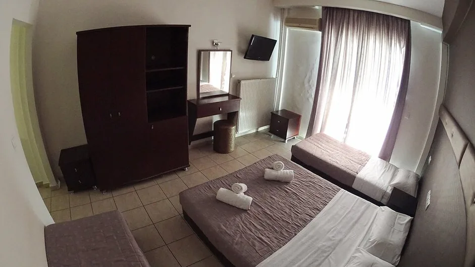 Paralia Inn raspolaže sa ukupno 41 sobom i apartmanom, sa približno 150 ležajeva, što ga svrstava u najveći objekat u lancu Erato Holidays. Strukturu smeštaja čine dvokrevetne, trokrevetne i četvorokrevetne sobe, kao i veći apartmani za pet ili sedam osoba, idealni za porodice ili manje grupe. Sve smeštajne jedinice su klimatizovane i imaju sopstveno kupatilo, balkon, frižider, televizor sa satelitskim kanalima i bežični internet, kao i centralno grejanje u zimskom periodu, što omogućava boravak tokom cele godine.([erato-holidays.gr](https://erato-holidays.gr/en/hotels/?utm_source=openai))