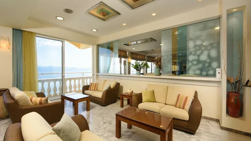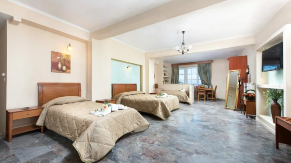 Smeštaj u hotelu obuhvata moderno uređene sobe i apartmane raspoređene u dva objekta. Postoje standardne dvokrevetne i trokrevetne sobe, kao i prostraniji apartmani sa odvojenim dnevnim delom, idealni za porodice ili društva. Većina jedinica ima balkon ili terasu sa direktnim ili bočnim pogledom na more, klima-uređaj, sopstveno kupatilo sa tušem, frižider i bežični internet. Pojedini apartmani mogu da prime do 4–6 osoba, pa su pogodni za veće porodice ili grupu prijatelja koji žele komforniji boravak uz prelep pogled na Pontikonisi.